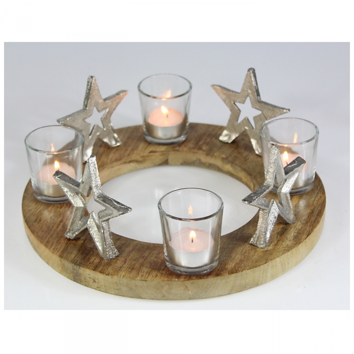 Adventný svietnik na stôl z mangového jemne opracovaného dreva, ktoré sa vyznačuje svojou pevnosťou a lesklým povrchom. Sviečky sú naviac ukryté pre bezpečnosť vášho interiéru v sklenenom kalíšku.