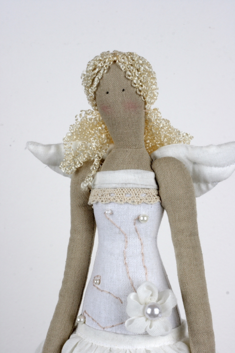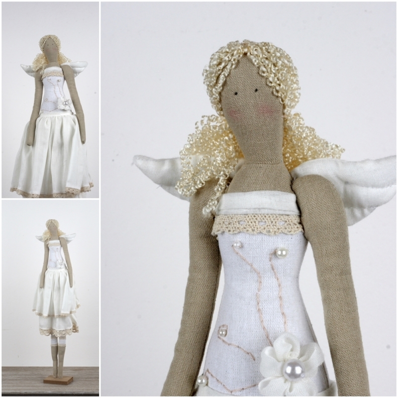 Andelko v bielych a smotanových tónoch je pripevnená na podstavci.