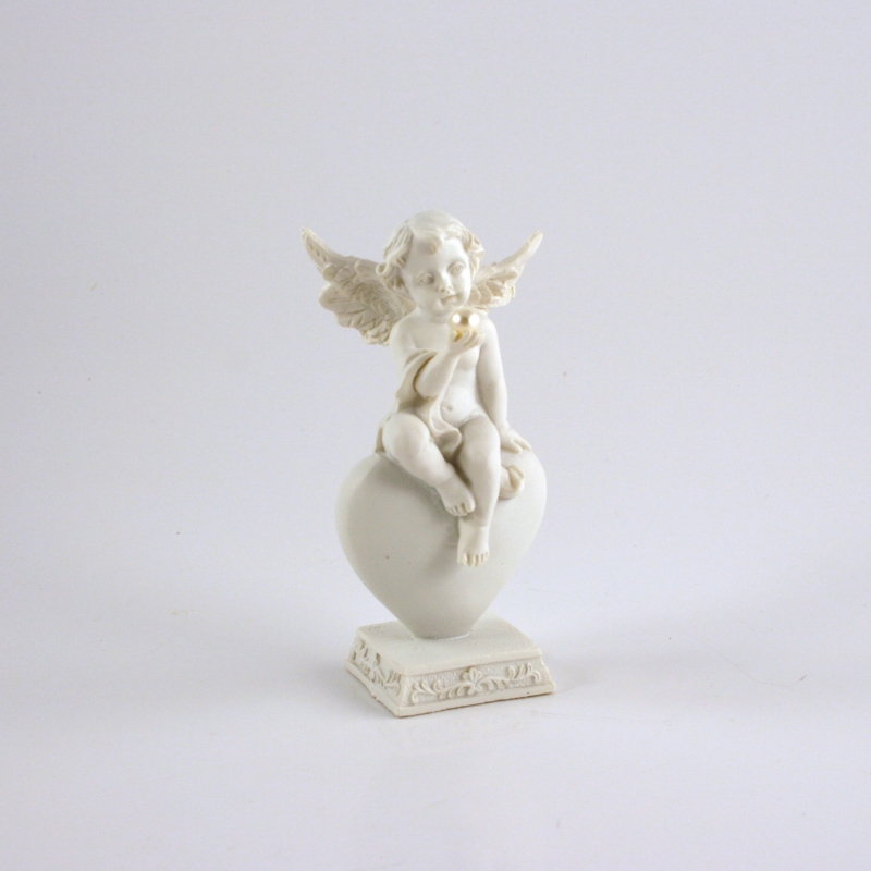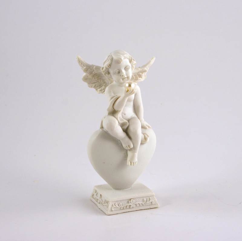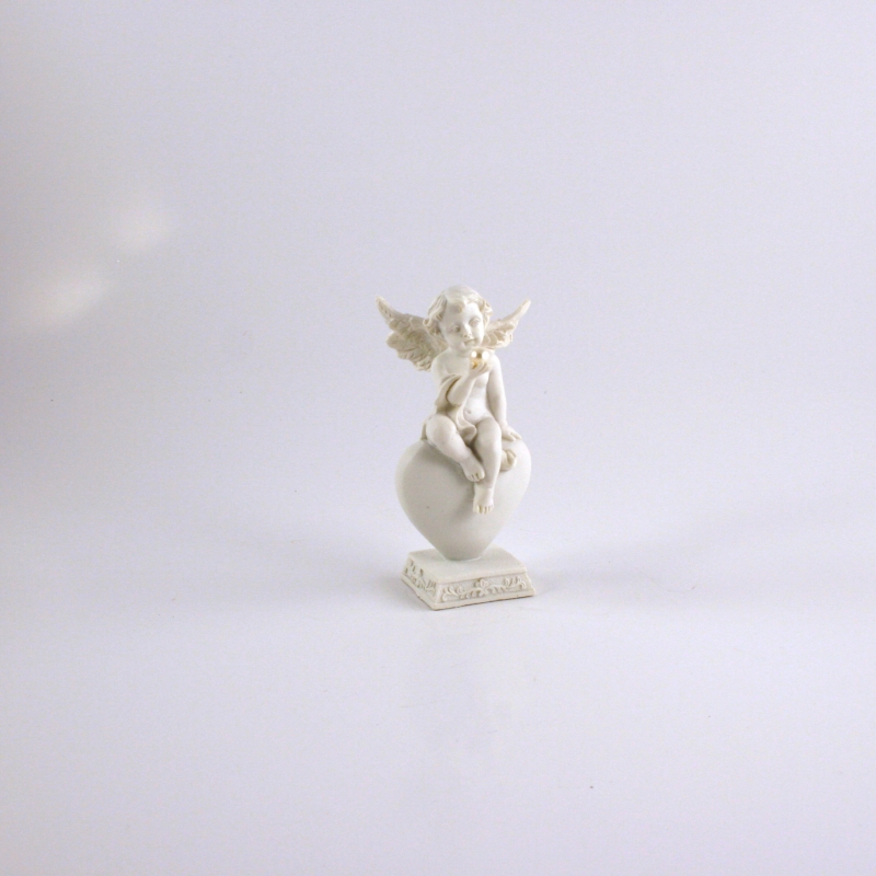 Anjel je možná príbuzný toho , ktorý má číslo dek2141 . Je mu totiž navlas podobný , dokonca aj odpočíva na veľkom bielom srdci . Veľkosť dekorácie je 13 cm .