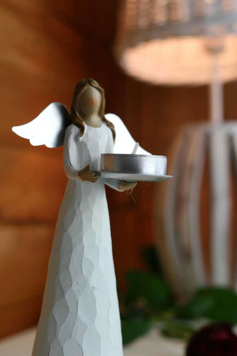Anjel drží na rukách tácku, ktorý slúži ako táckou na čajovú sviečku. Je to teda akýsi anjelský svietnik.