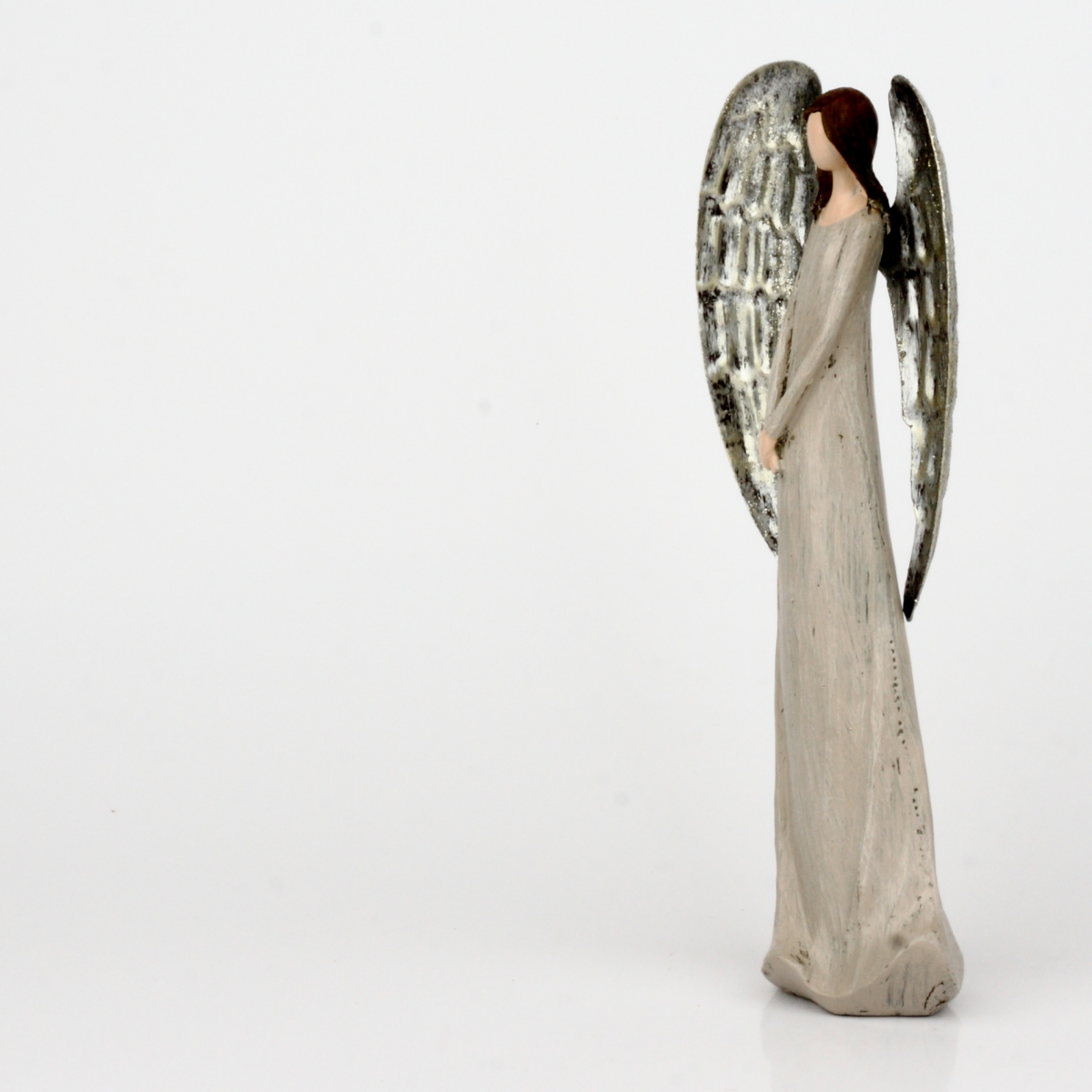 Soška anjela je nežná, krehká a elegantné. Štíhla postava v dlhých šatách je skvelým kontrastom k veľkým výrazným krídlam. Urobte radosť sebe alebo vykúzlite úsmev na perách niektoré žene vo vašom blízkom okolí.