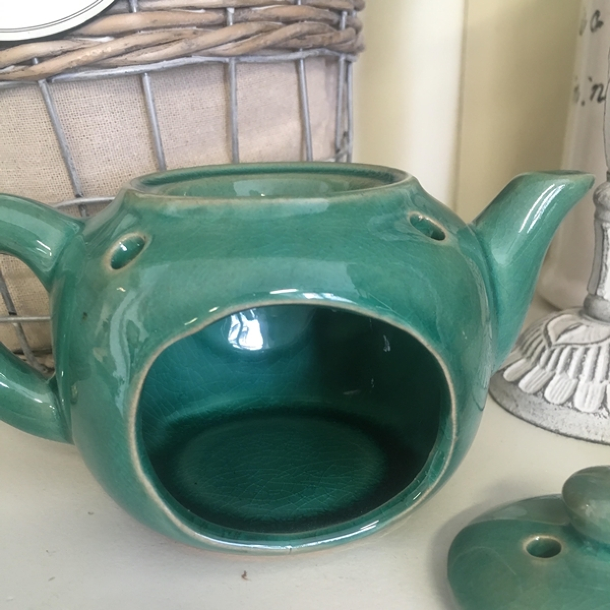 Konvička má krásnu zelenú glazúru a zo zadnej strany otvor na čajovú sviečku.