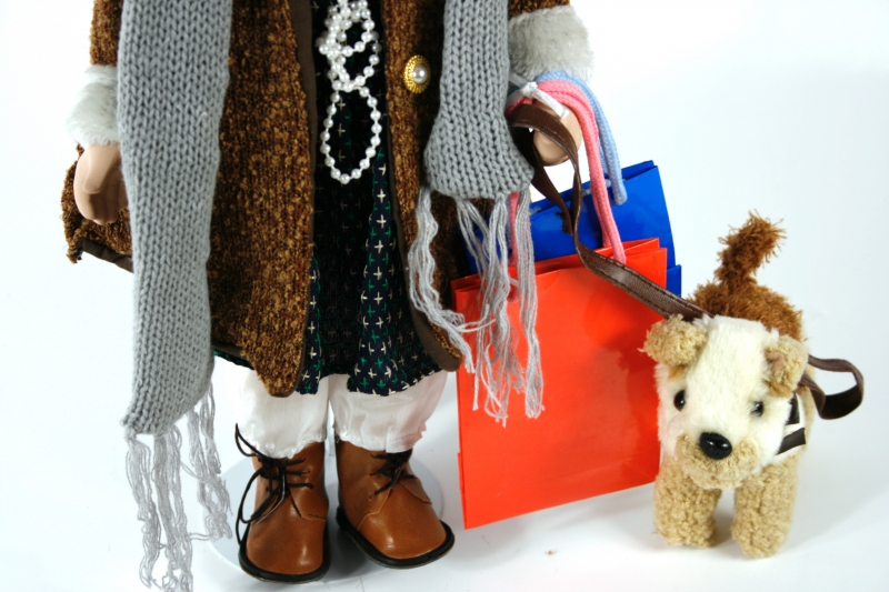 Okrem zelených šiat a hnedého kožúšku má babička tiež šedú šál a nechýba jej ani korále okolo krku . Psík na vodítku je menšieho vzrastu a bielo - hnedej farby .