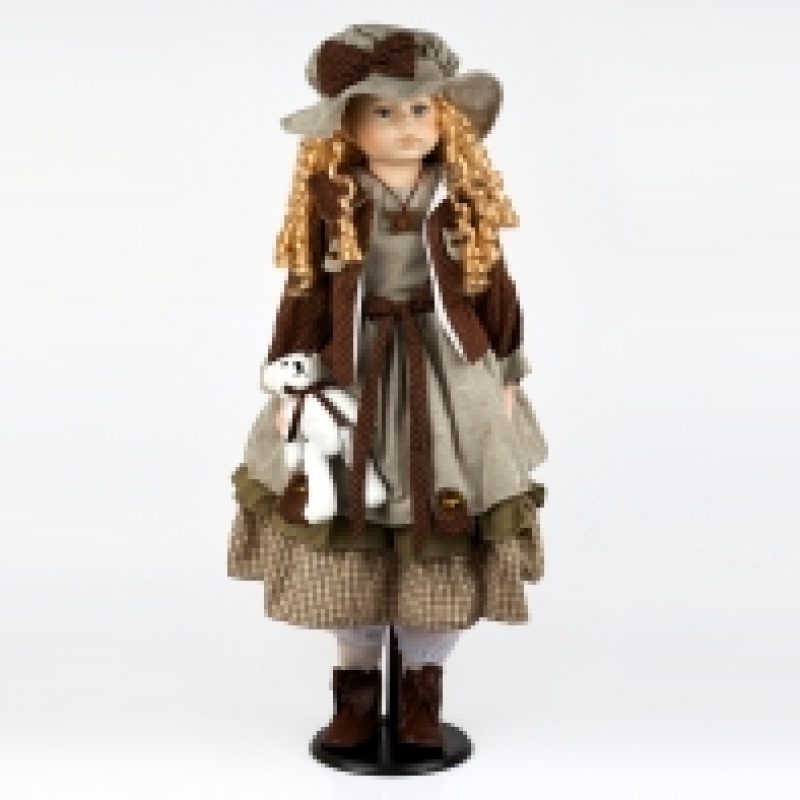 Panenka s kudrnatými vlásky. Šedé venkovské šatičky s kloboučkem ze stejného materiálu doplňuje hnědá kostkovaná sukýnka, sněhově bílé spodní kalhoty, ponožky a hnědé kožené botičky. v ruce panenka drží bílého medvídka.