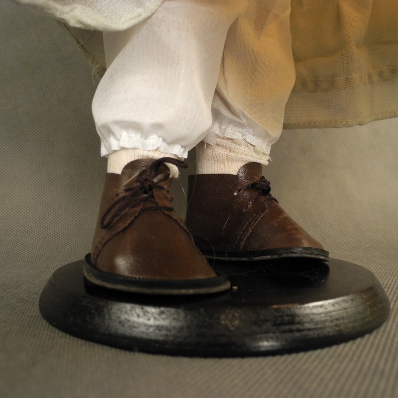 Na nožkách má bílé punčochy a hnědé kožené botičky.