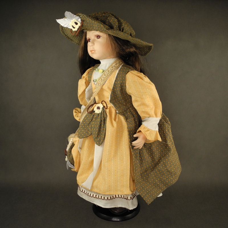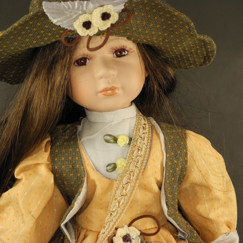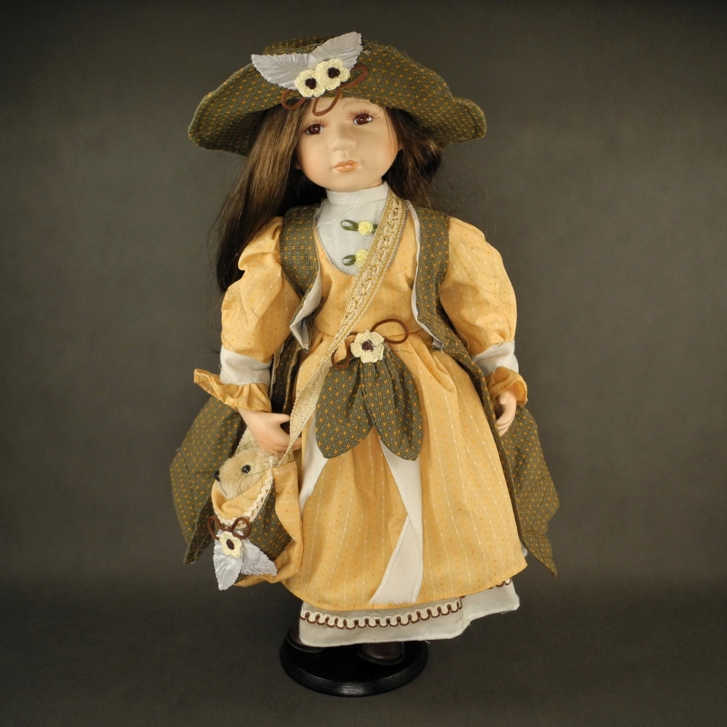 Panenka Adéla 60cm s medvídkem v tašce. Oblečeny má béžovo oranžové plátěné šaty zdobené hnědo zelenou stuhou. Na nohou má koženkové hnědé botičky na šněrování.