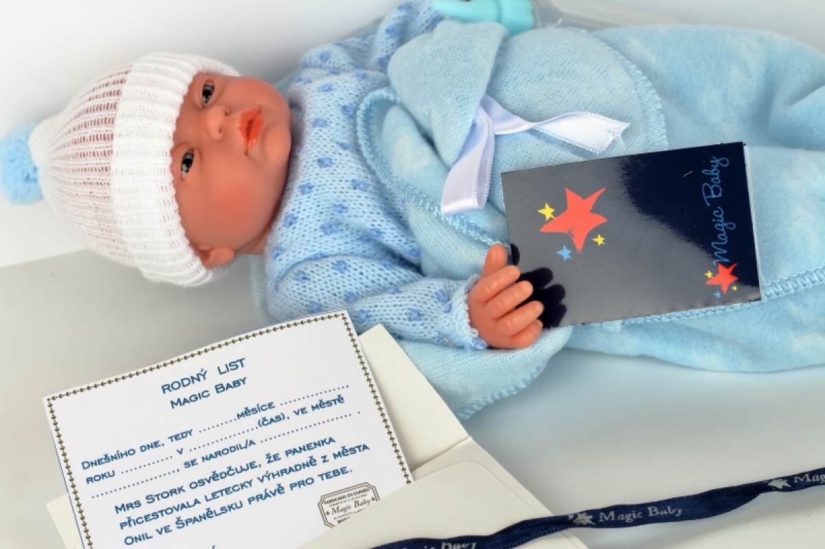 Realistická bábika má čiapočku, svetrík, deku, fľašu a rodný list.