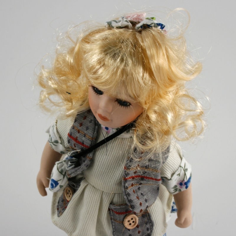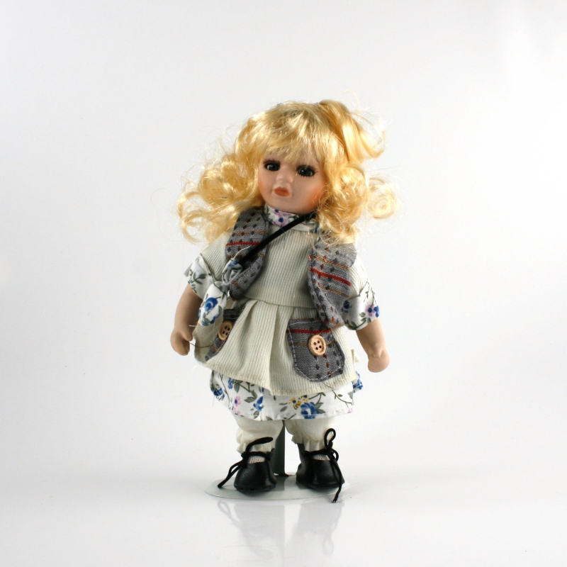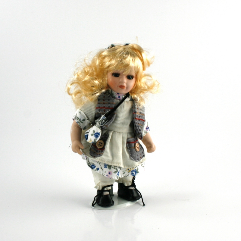 porcelánová bábika Magdaléna porcelánová meria 20 cm . Má výrazné čierne oči , ktoré kontrastujú s dlhými vláskami zlatistej farby . Bábika má kvetované šatôčky , cez ne si obliekla bielu zásterku a sedavé vestičku .