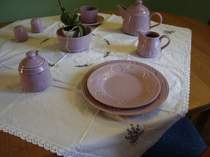 Obrus Provence , ktorý si môžete prezrieť na fotografiu i krátkom videu , má štvorcový rozmer o veľkosti strany 90 cm . Jedná sa o biely bavlnený obrus ozdobený uprostred iv rohoch nádhernou výšivkou s motívom levandule .