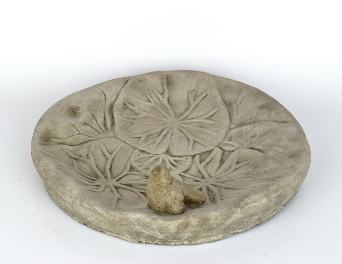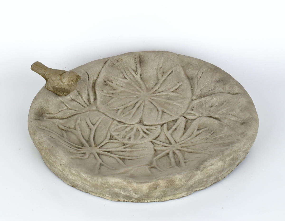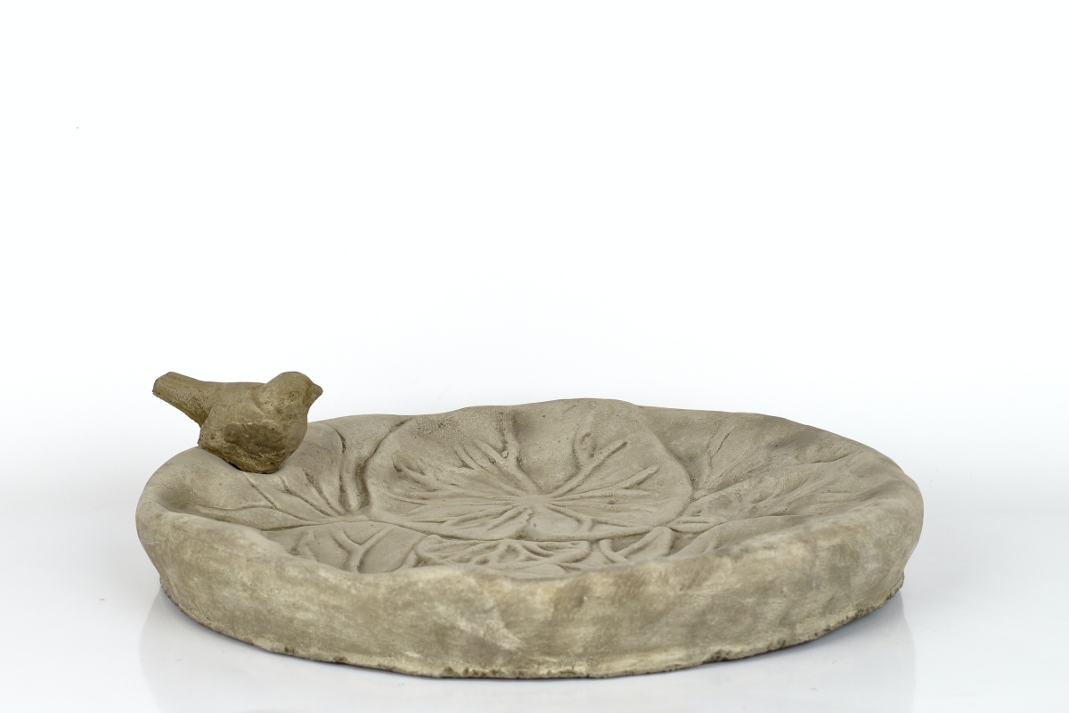 Betónové pítko s dekoráciou vtáčika, použiteľné tiež ako krmítko, vyrobené v ČR