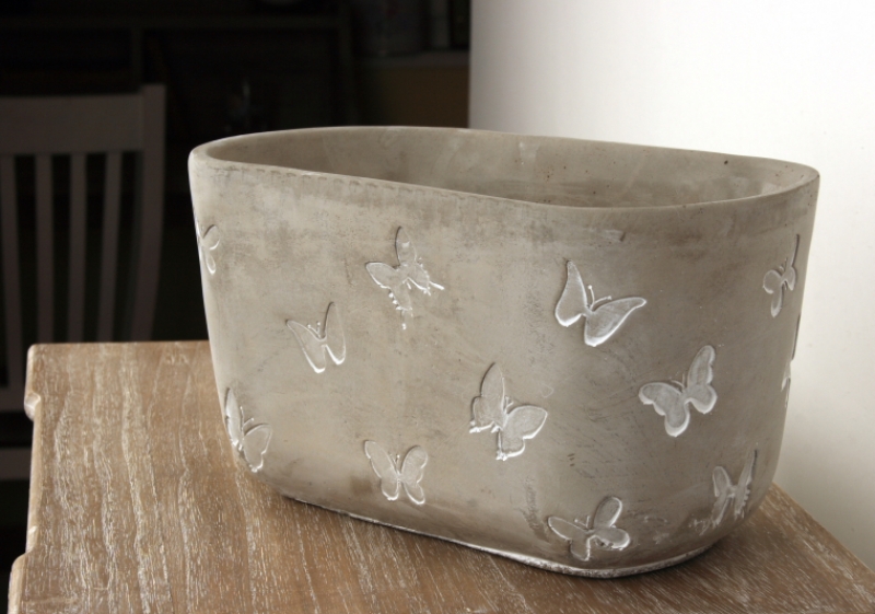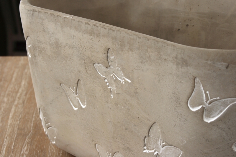 Kvetináč má tvar veľkej misy. Povrch s ľahkou patinou má surový vzhľad, ktorý zjemňuje použitý motív motýľov.