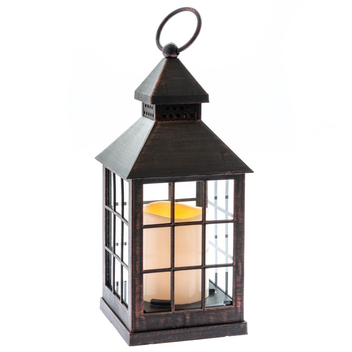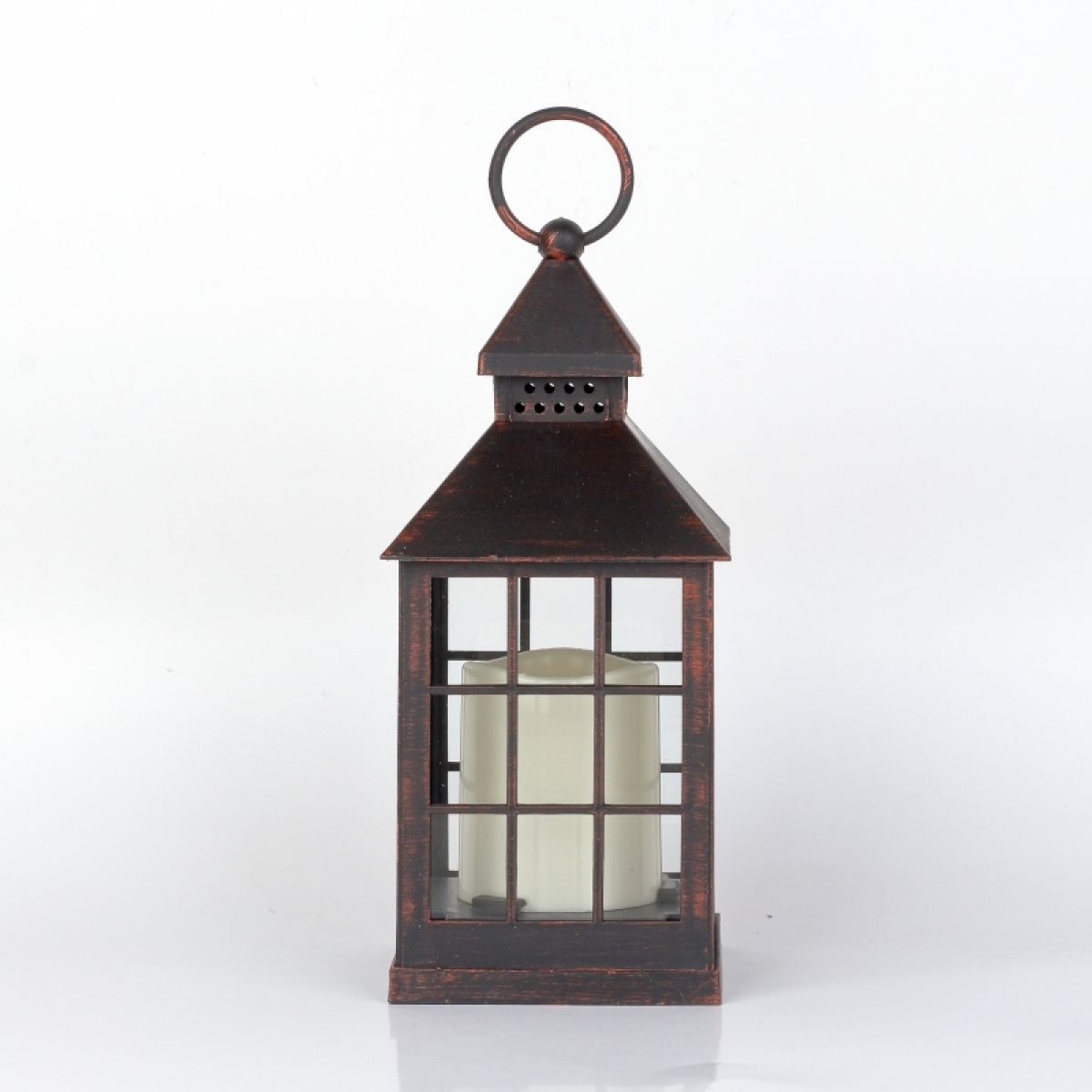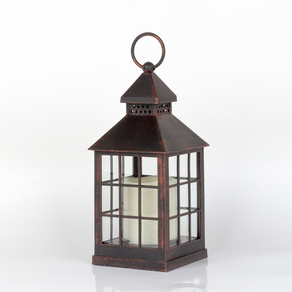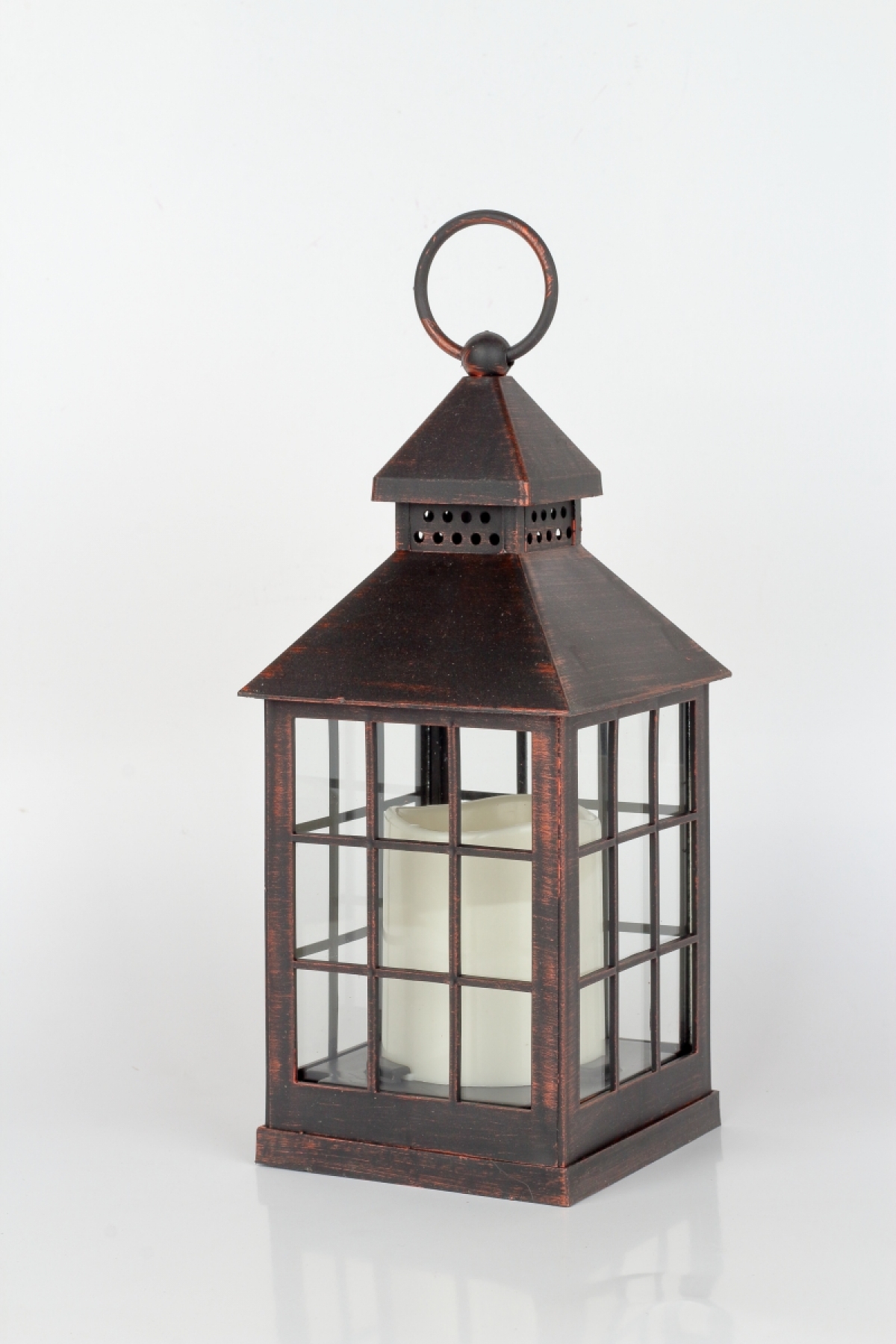 Dokonalá imitácia plechové lucerny s horiace sviečkou s priemerom 5,5 cm a výškou 7cm.