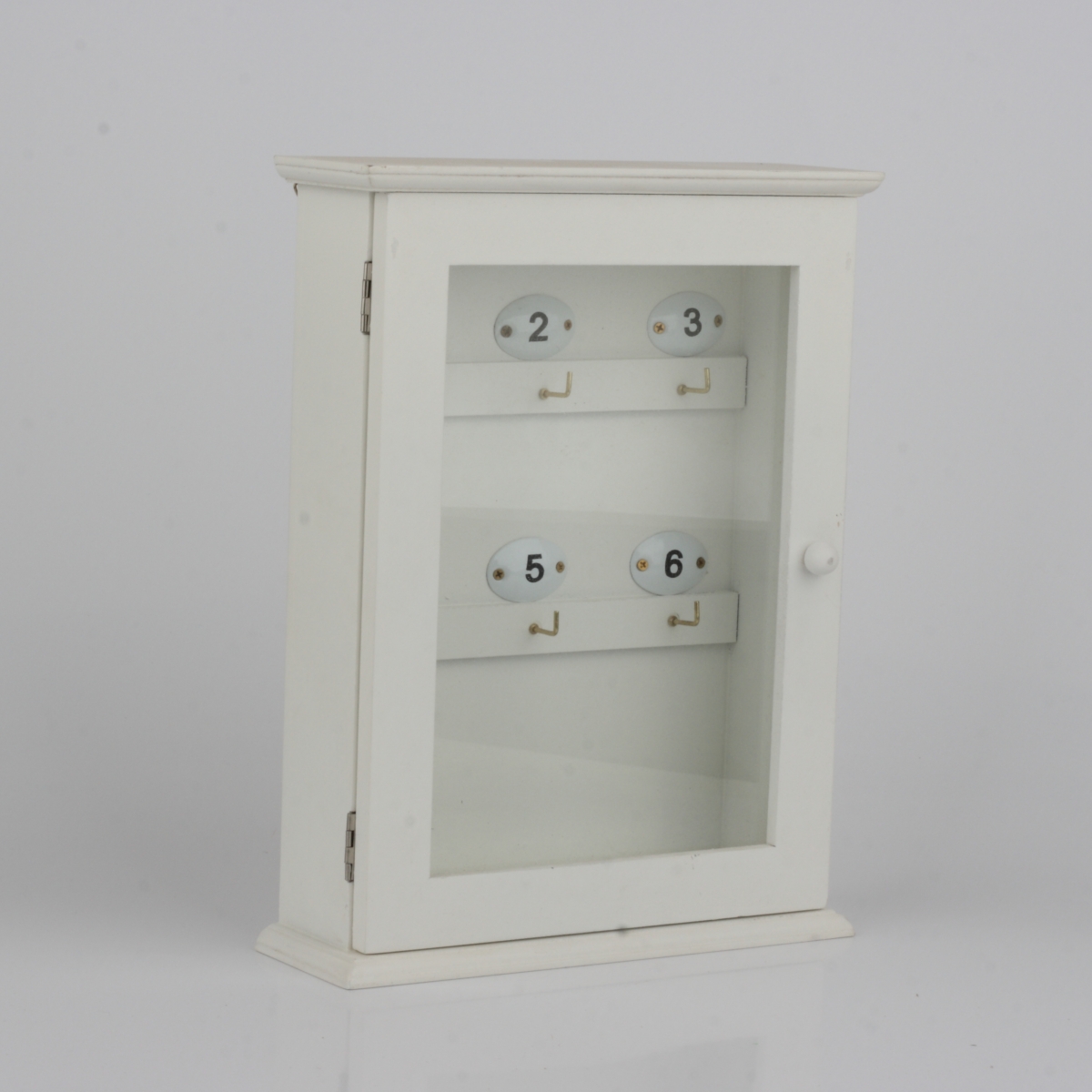 Skrinka má 6 háčikov a presklené dvierka.