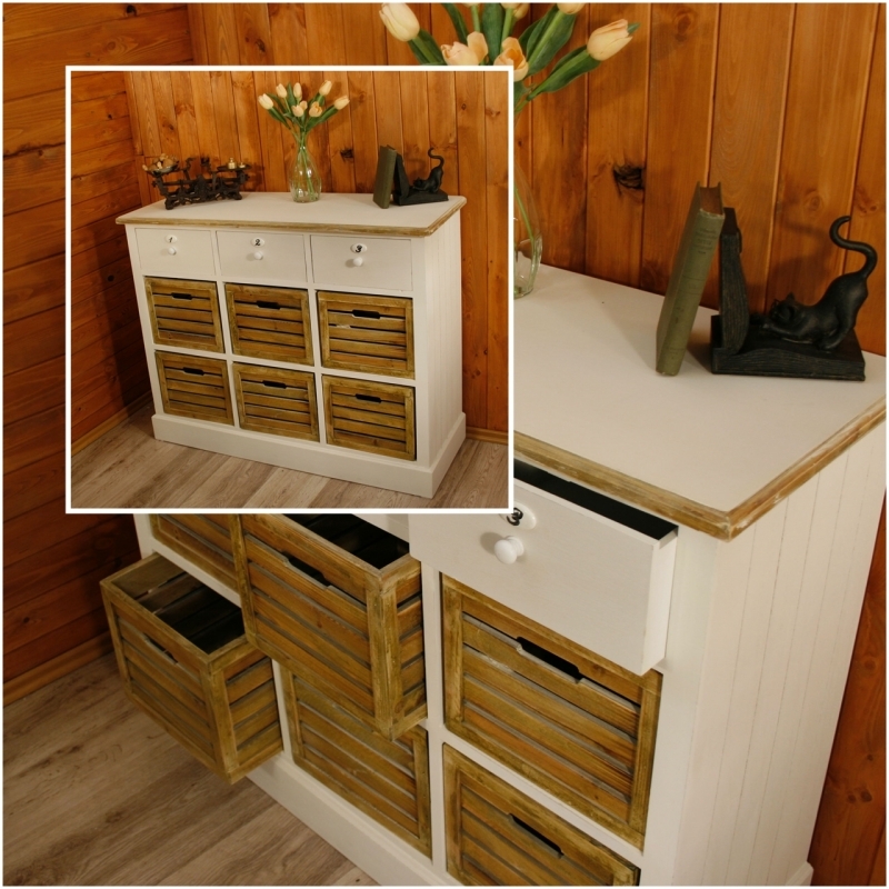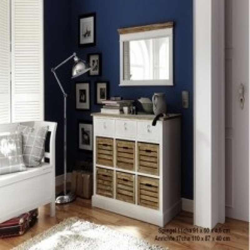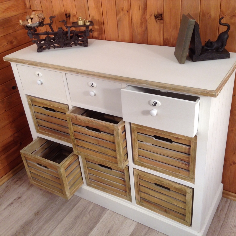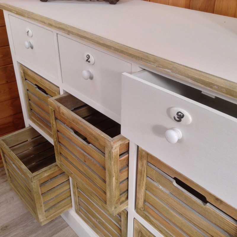 Komoda má rozmer 110 x 87 x 40 cm. V jej hornej časti sú tri biele šuplíky, pod nimi nájdeme šesť zásuviek. Tie majú vyrobená dvierka tak, aby do vnútorného priestoru mohol prúdiť vzduch. Ľahko je otvorte vďaka výrezom, ktorými sú opatrené.