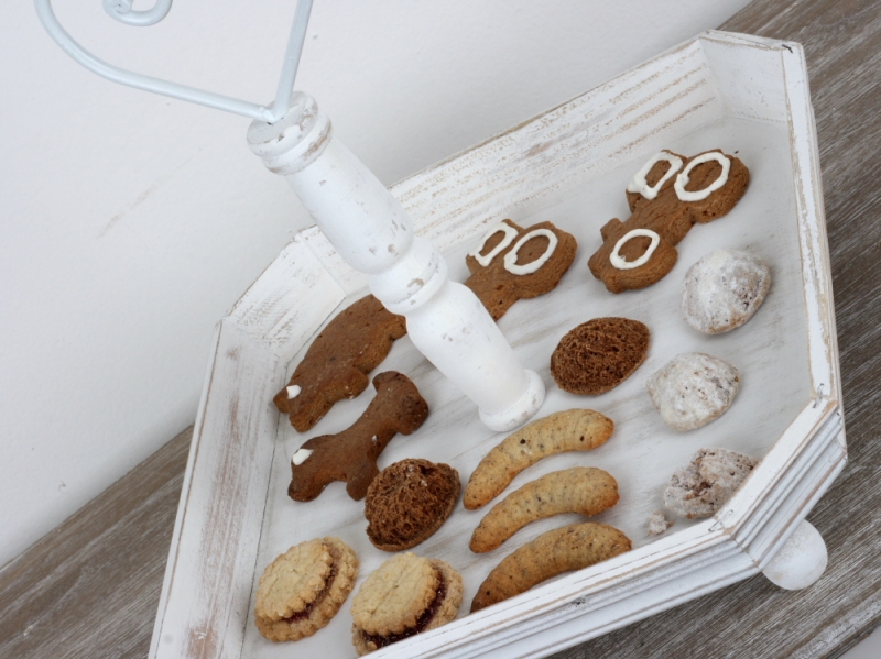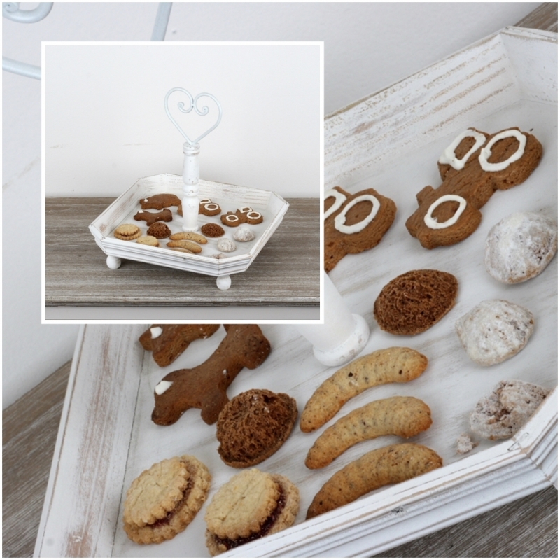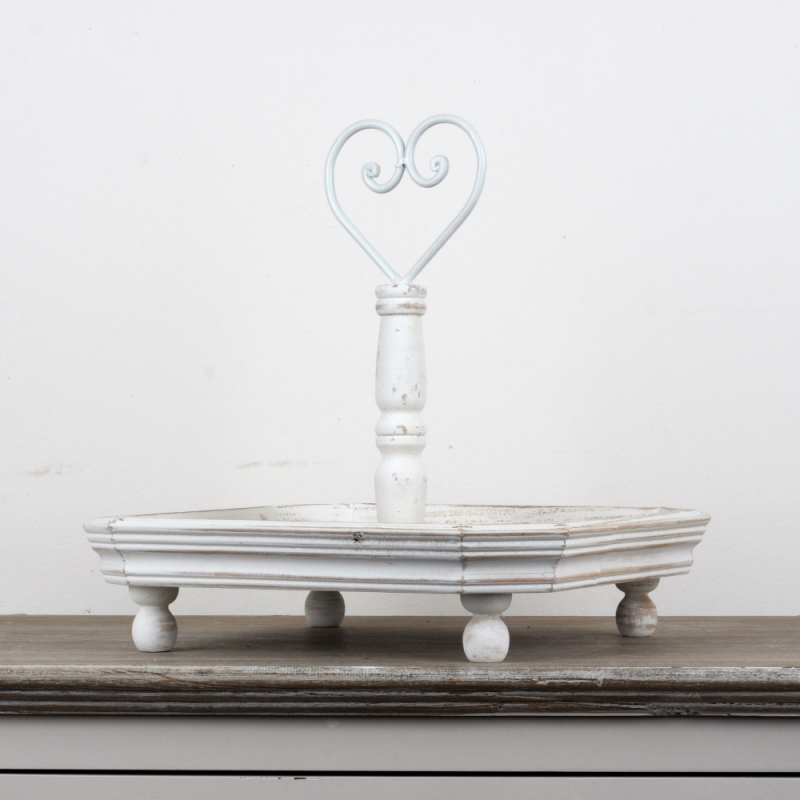 Biely drevený etažér s patinou 31x31cm uprostred stola krásne vynikne s ovocím i sladkosťami.