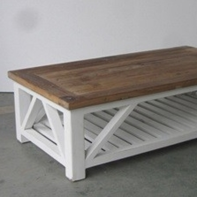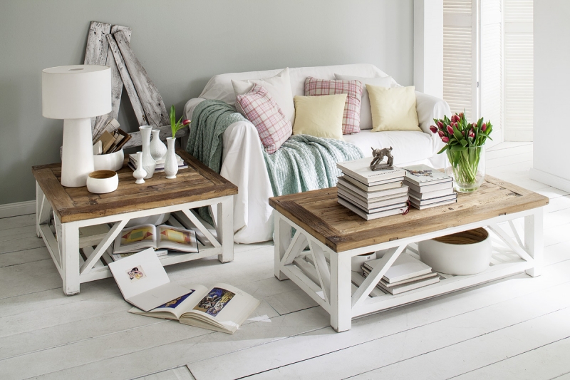 Konferenčný stolík s policou z bielych latiek a masívnou doskou v prírodnej farbe dreva bude dominantným kusom každého obývacej izby. Stolík je vyrobený z masívu, vďaka kombinácii bielej farby a dreva pôsobí jednoducho a sviežo.