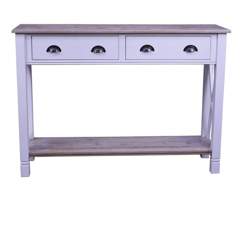 Biely vidiecky konzolový stolík 135x95x40cm s dvomi zásuvkami s obľúbenými úchytkami v tvare vreciek. Konzolový stôl má hornú dosku a policu v prírodných tónoch dreva, ktoré tak spoledčně s bielym stolom tvoria dokonalý pár. Boky stola sú vyplnené malými trámy do tvaru kríža.