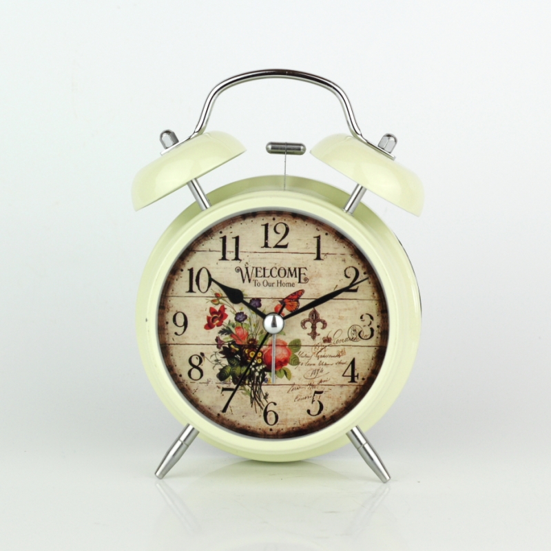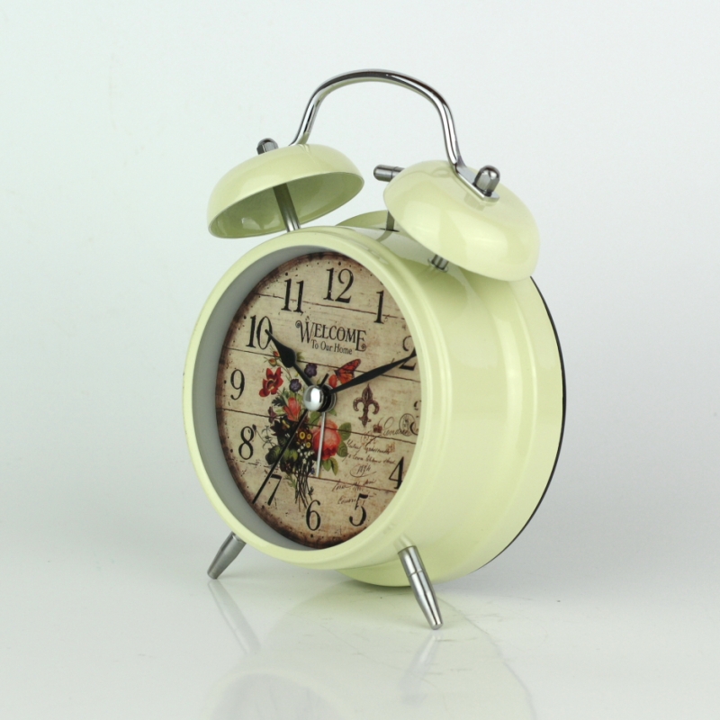 Budík Welcome to our home 17cm v decentnej krémovej farbe, ciferníkom s otlčeným pozadím a motívom lúčnych kvetov.