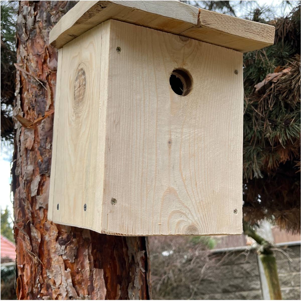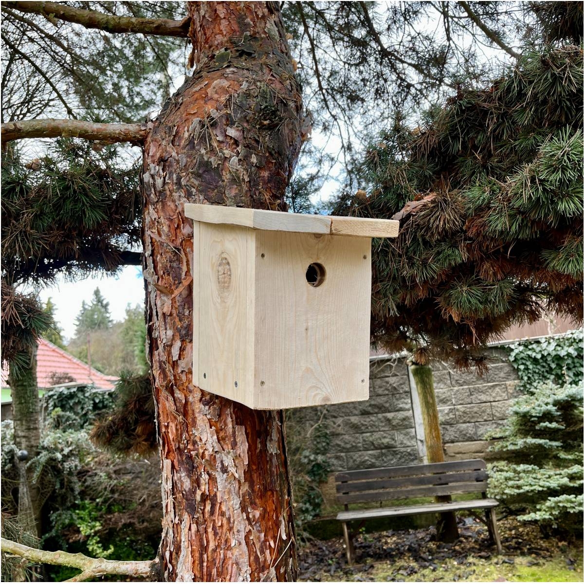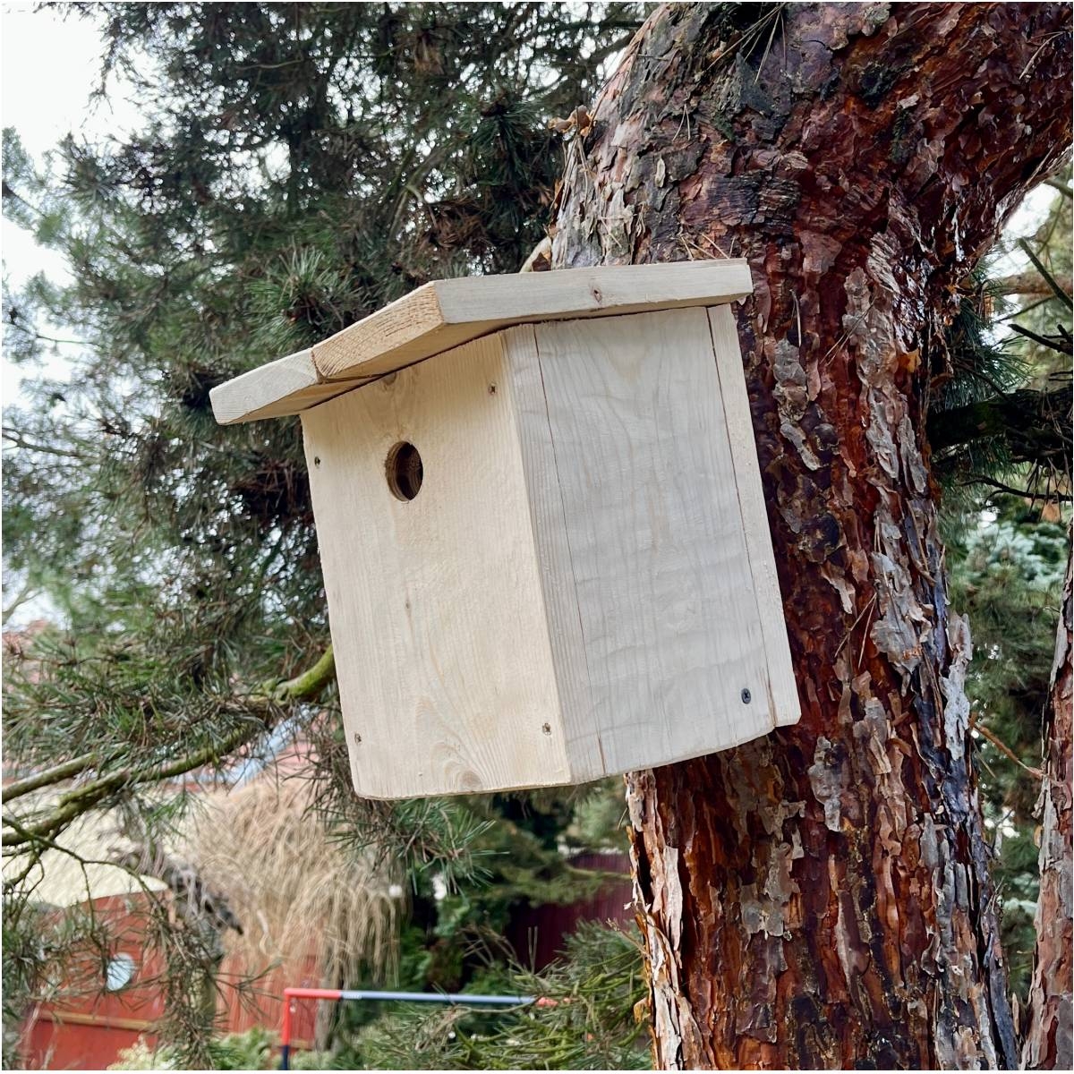 Na strome, na stene domu, na kôlni alebo na chalupe pôsobí táto búdka prirodzene a neruší okolie. Nie je to len praktický výrobok. Je to malý detail, ktorý môže do záhrady vrátiť život, ranné štebotanie a dobrý pocit, že ste vybrali správne.