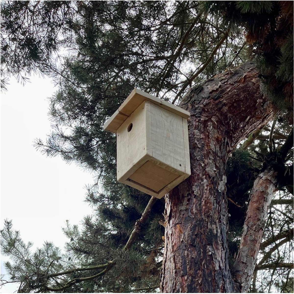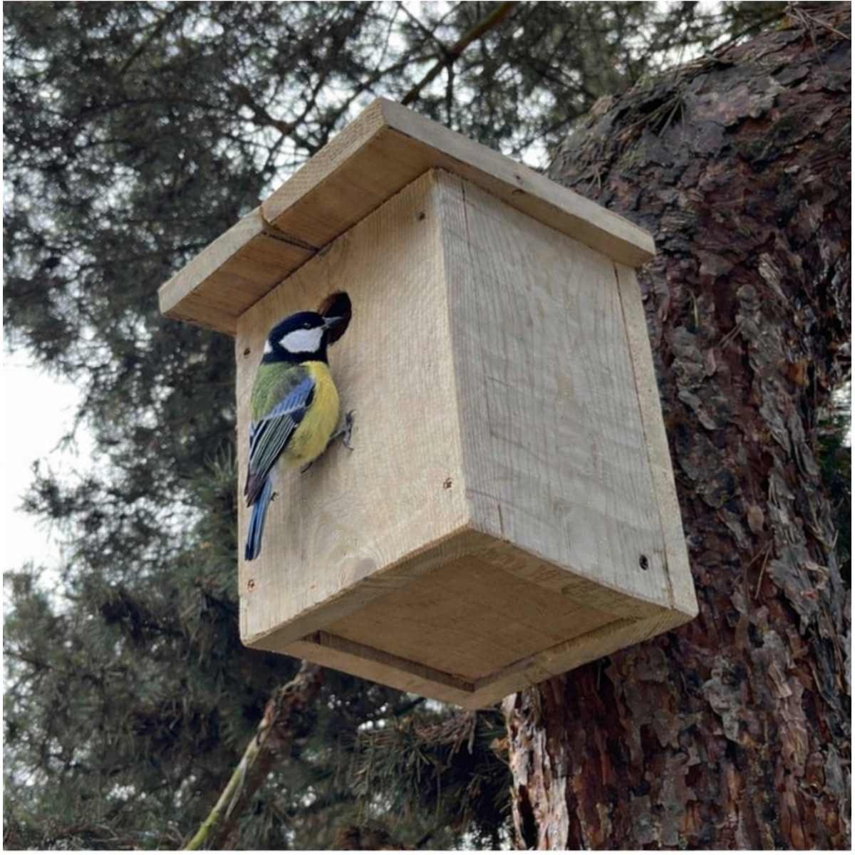 Búdka pre koňadry bez náteru ponecháva drevu jeho natur vzhľad a vytvára pokojné miesto, kam sa môžu sýkorky veľké vracať, hniezdiť a zostať nablízku.