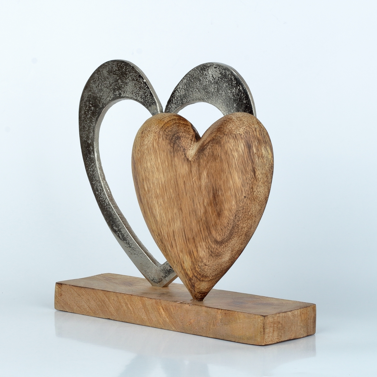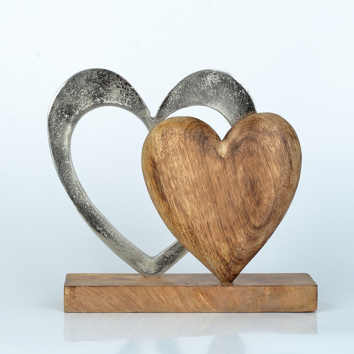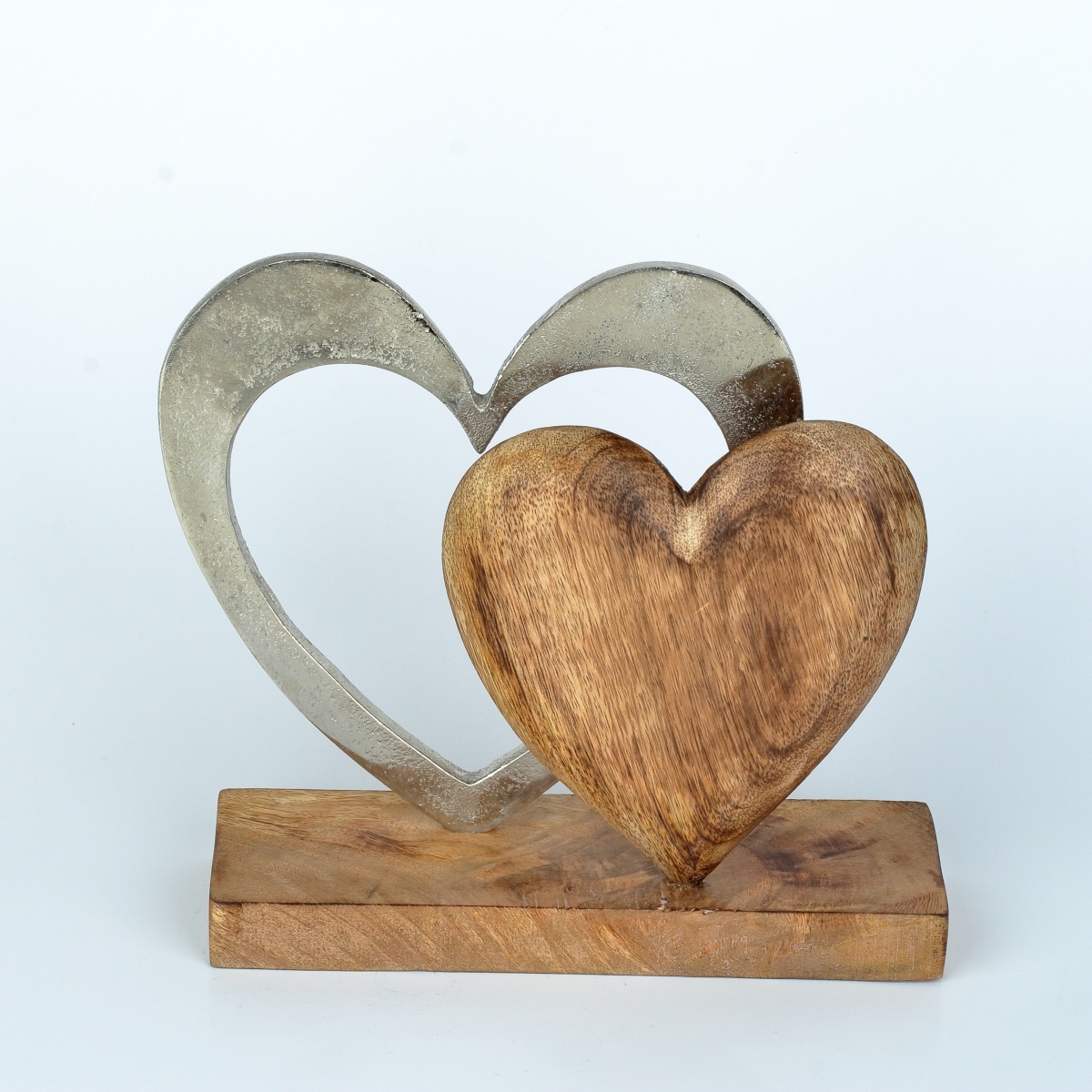 Bytová dekorácia dve srdcia z hliníka na drevenom podstavci