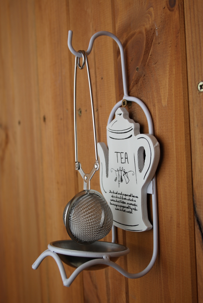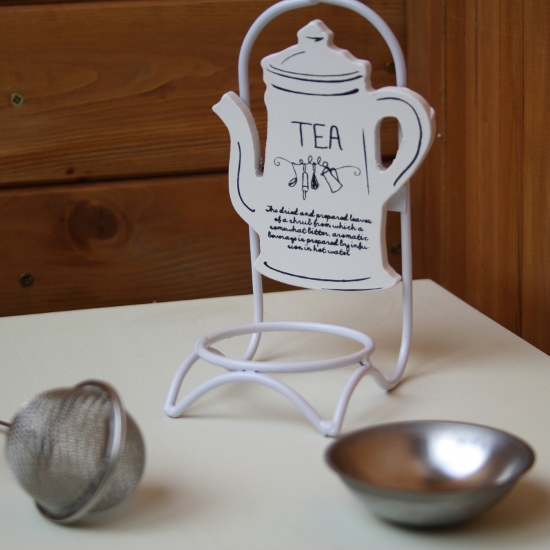 Stojanček je kovový v bielej farbe, na zadnej strane stojančeku je drevená kanvička s textom. Stojanček má praktickú mištičku, do ktorej odkvapkávajú zvyšky čaju.