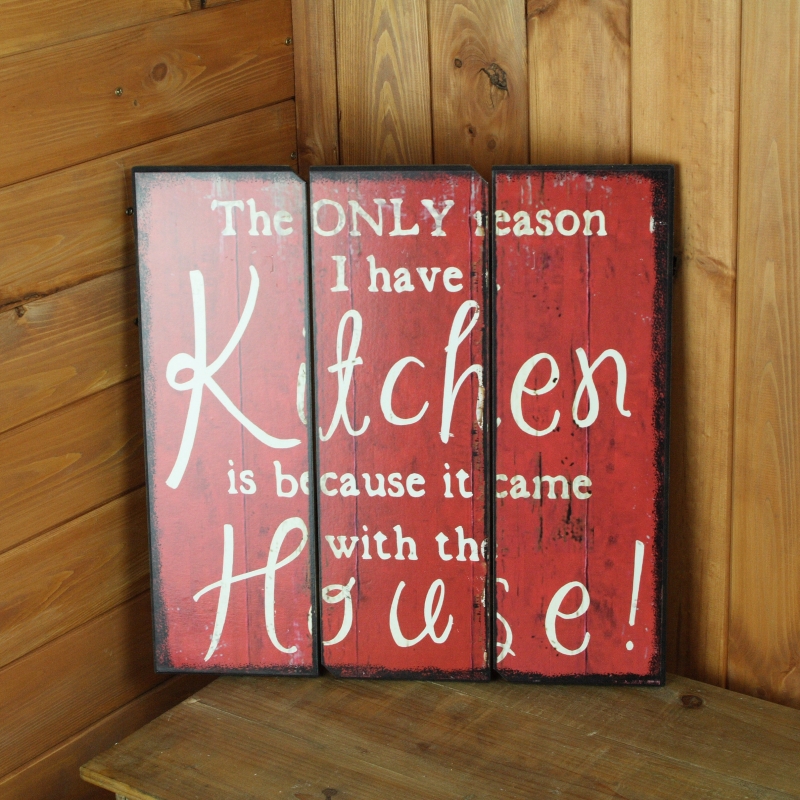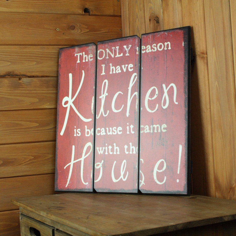 Drevená ceduľa s nápisom The only reason i have kitchen is because it came with the house alebo ak Jediný dôvod, prečo mám kuchyni je ten, že je súčasťou domu ...