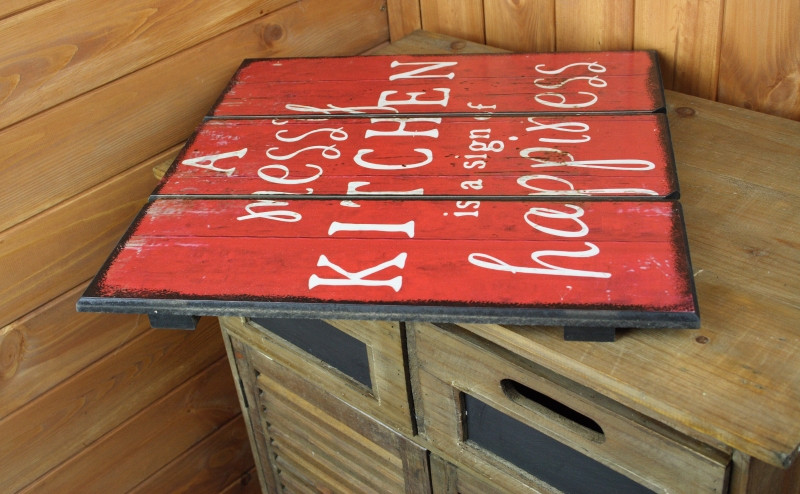 Drevená ceduľa s nápisom A messy kitchen is a sing of happiness, alebo ak Chaotická kuchyňa je znamením šťastia ...
