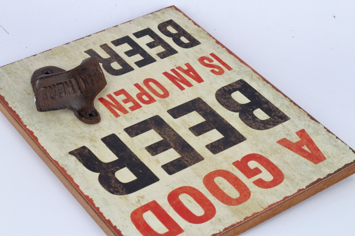 Cedule s otváračom fliaš A GOOD BEER IS AN OPEN BEER 18x23cm perfektne oživí stenu a keď bude treba, vo chvíľke otvorí prechladnutie fľašu a uhasí smäd.