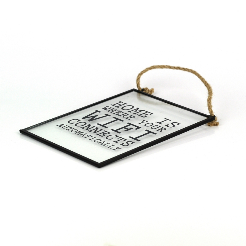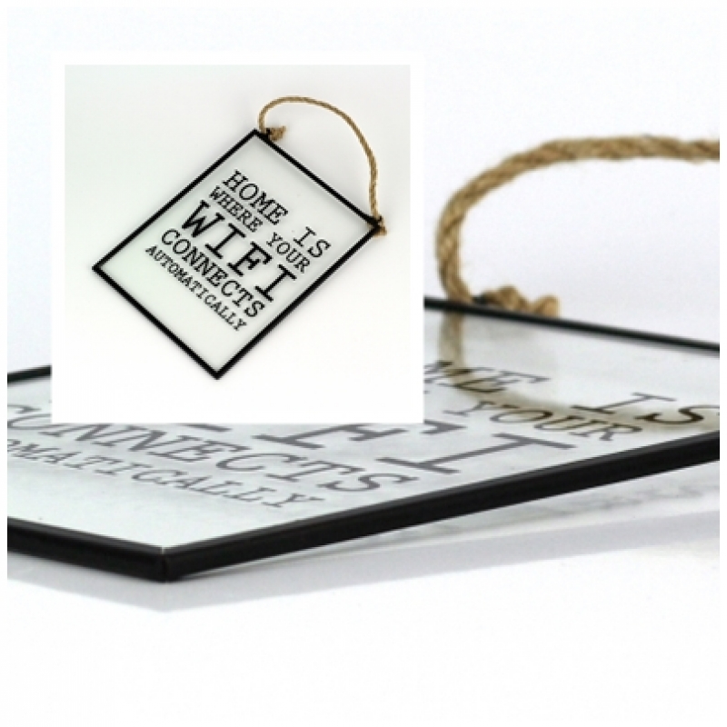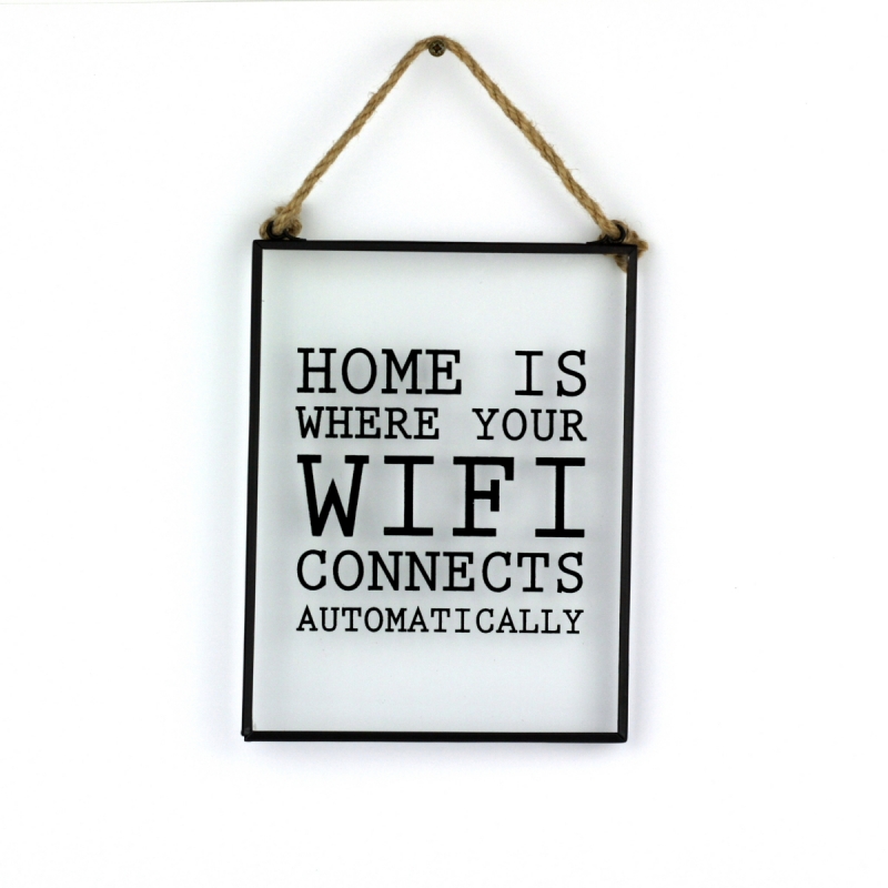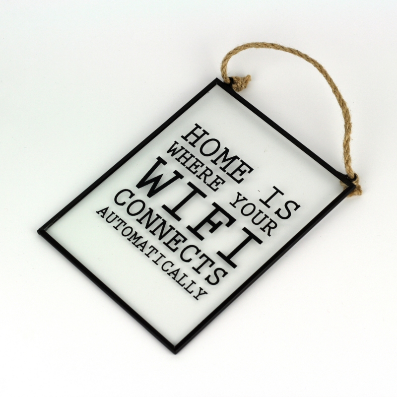 Vtipná sklenená ceduľa s nápisom Home is where your wifi connects automatically prezradí o majiteľovi takmer všetko. Bez wifi jednoducho ani ranu.