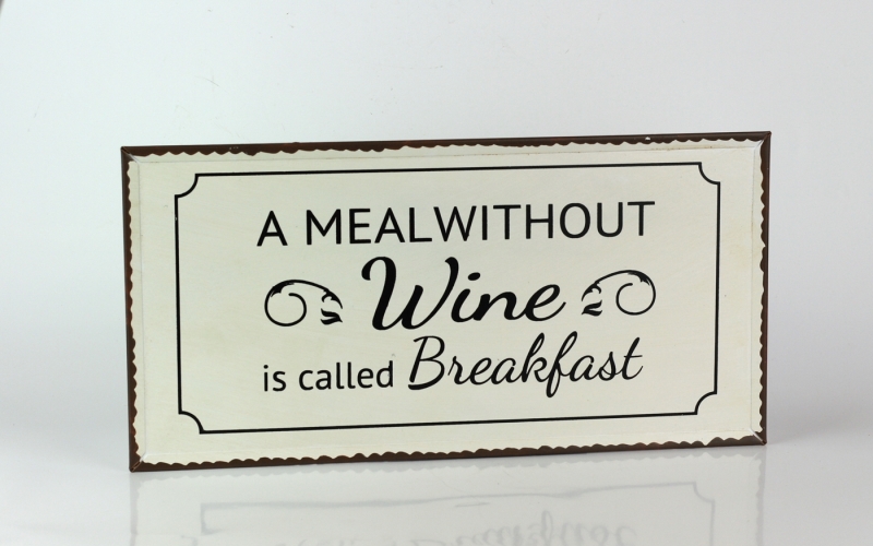 Plechová ceduľa s textom "Jedlo bez vína sa nazýva raňajky".