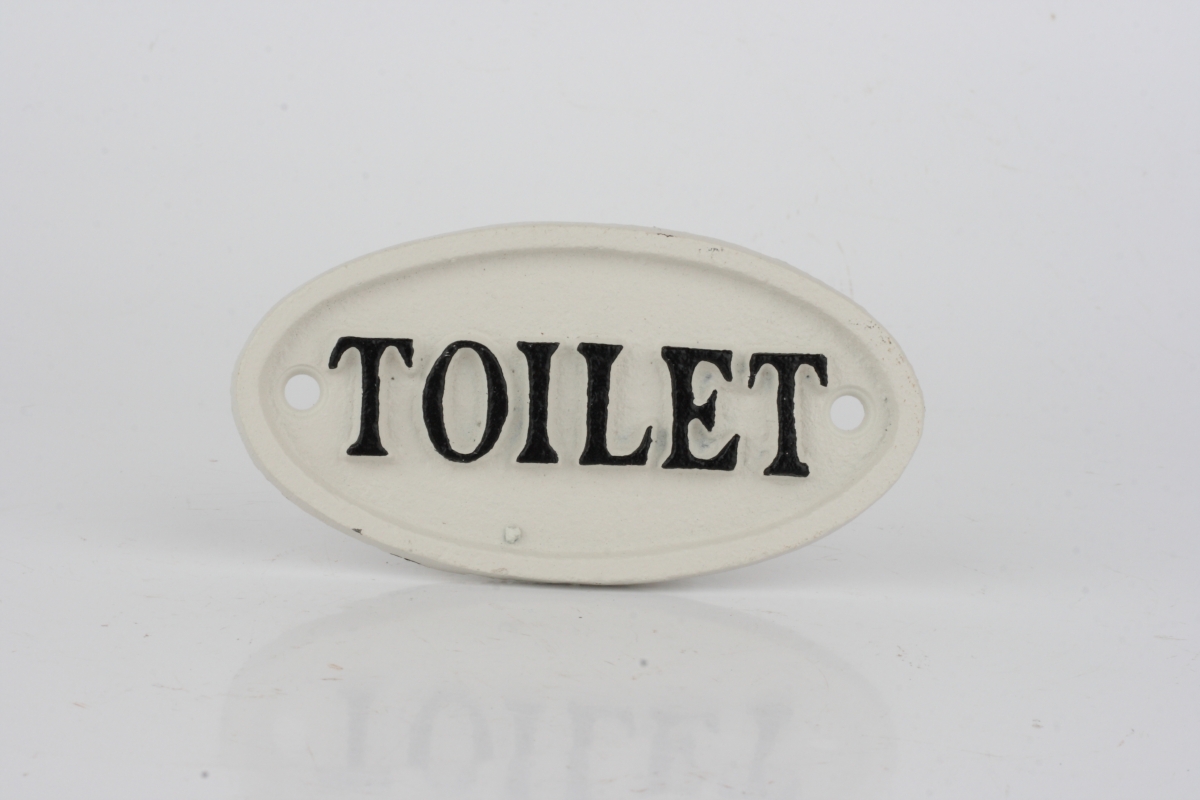 Ceduľka na dvere Toilet 10x5cm poradia, do ktorých dverí vstúpiť.