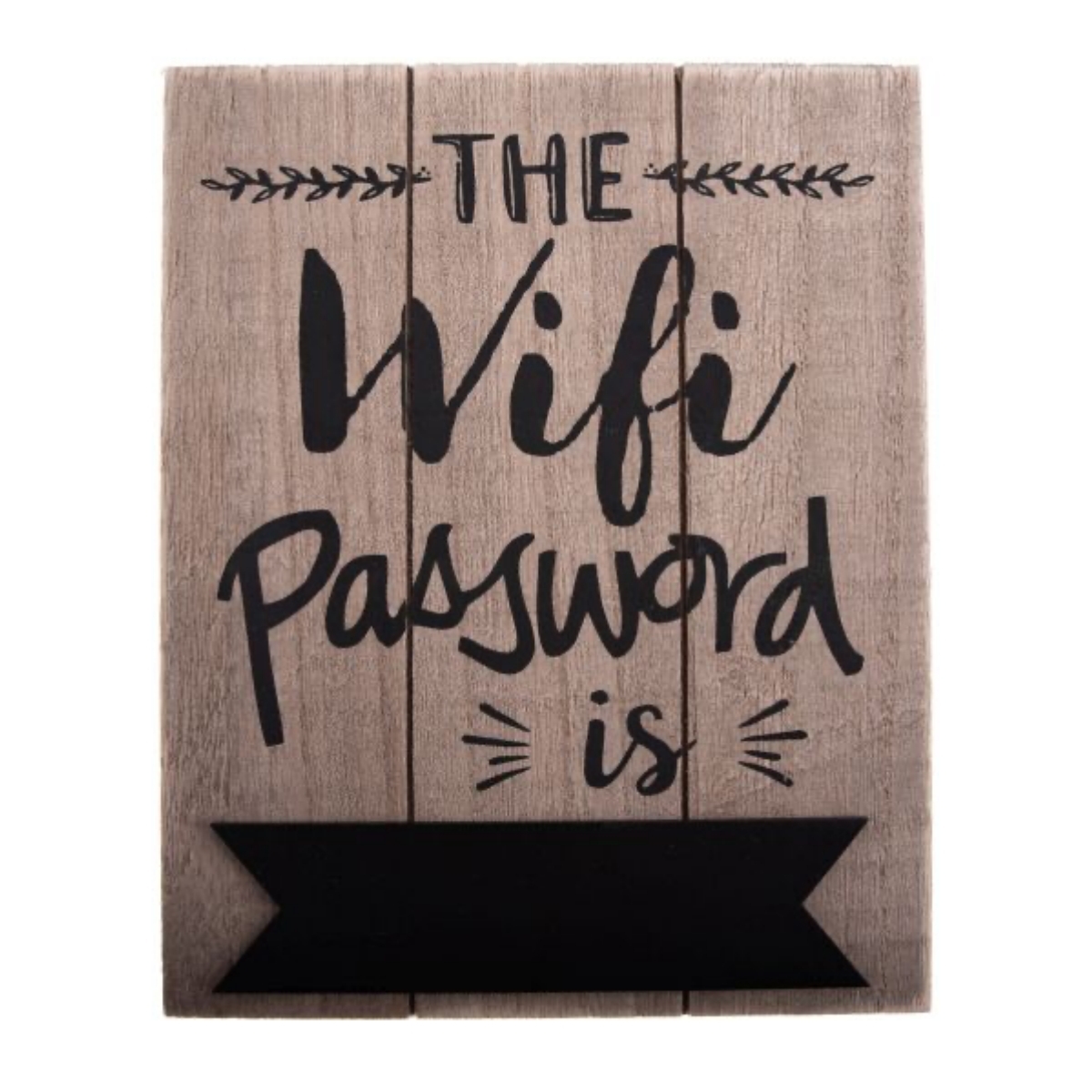 Štýlová drevená ceduľa, na ktorej vo vašom podniku môžete zverejniť heslo na bezdrôtový internet. Na tabuľke, z troch drevených dosiek, je ozdobný nápis THE Wifi password is. A pod ním je umiestnená čierna tabuľka, kam ho môžete vpísať.