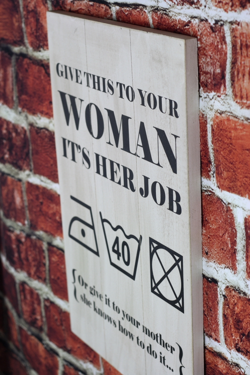 Cedule Give this to your woman 38x55cm aneb "Daj to svojej žene, je to jej práca - alebo svojej matke, ona vie, ako na to." je vtipným darčekom pre všetkých mužov, ktorí si s domácimi prácami nie sú moc istí.