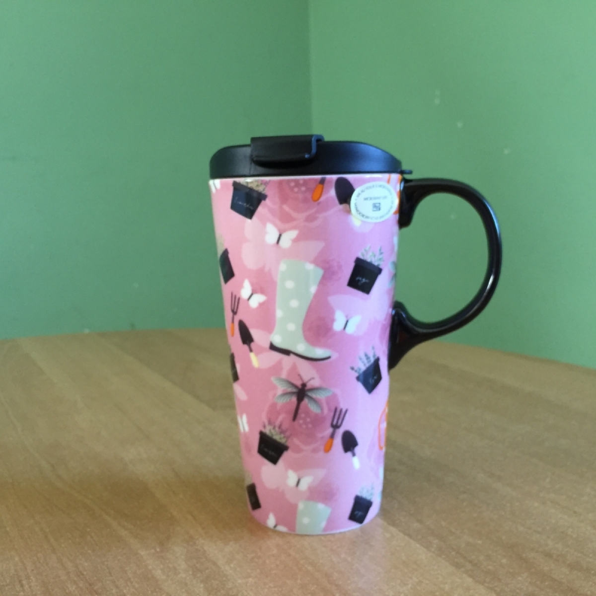 Cestovný hrnček s viečkom a uchom v ružovej farbe.