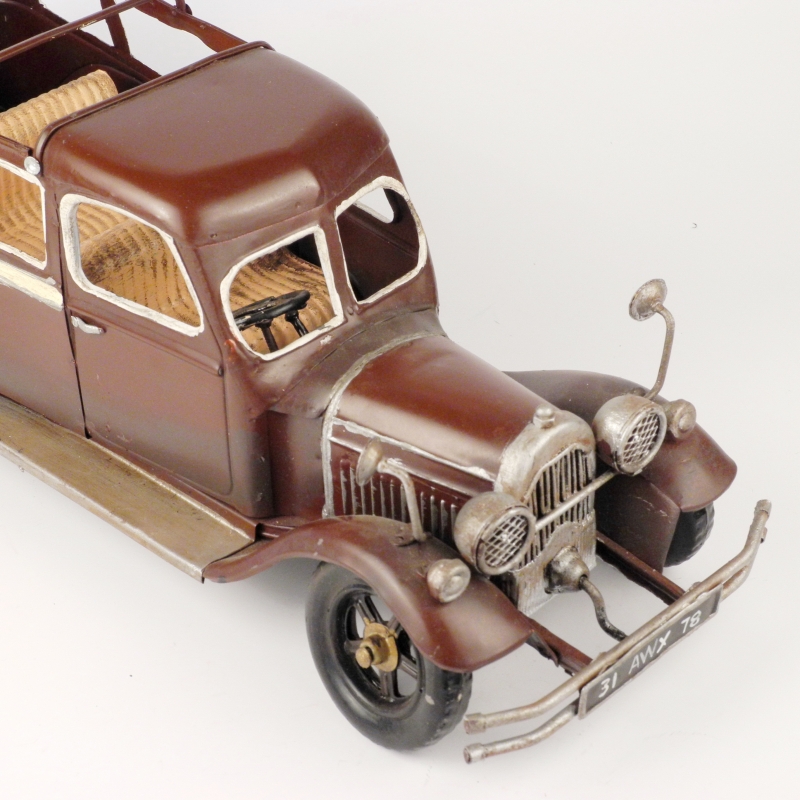 Kovový model četnického auta o rozměrech: 35cm délka, šířka vozidla 13cm a výška střechy 14cm.
