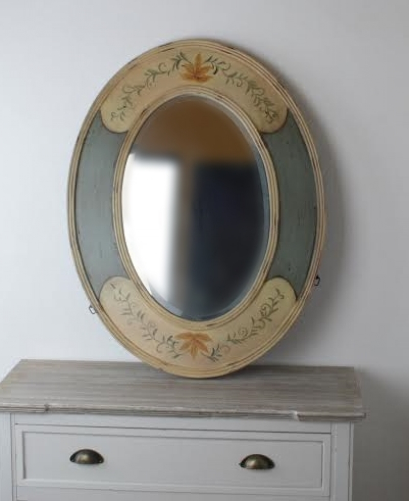 Oválne drevené zrkadlo je ručne maľované a jeho silný, takmer 3,5 cm hrubý, rám z neho robí skutočný originál. Môže byť zavesené na obielená horizontálne aj vertikálne
