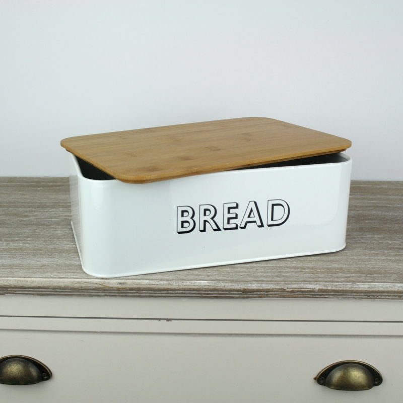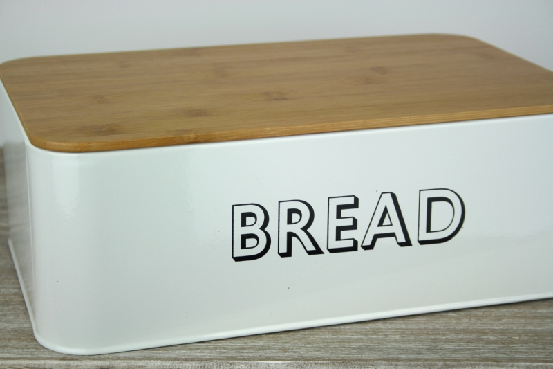Chlebník je kovový s dreveným vekom, ktoré chráni pečivo pred nenechavými hmyzom. Na prednej strane chlebníka je nápis "bread", teda chleba. Na prvý pohľad je jasné, čo sa v krásnej krabici skrýva. Chlebník v rovnakom dizajne je dostupný tiež v krémovej farbe.