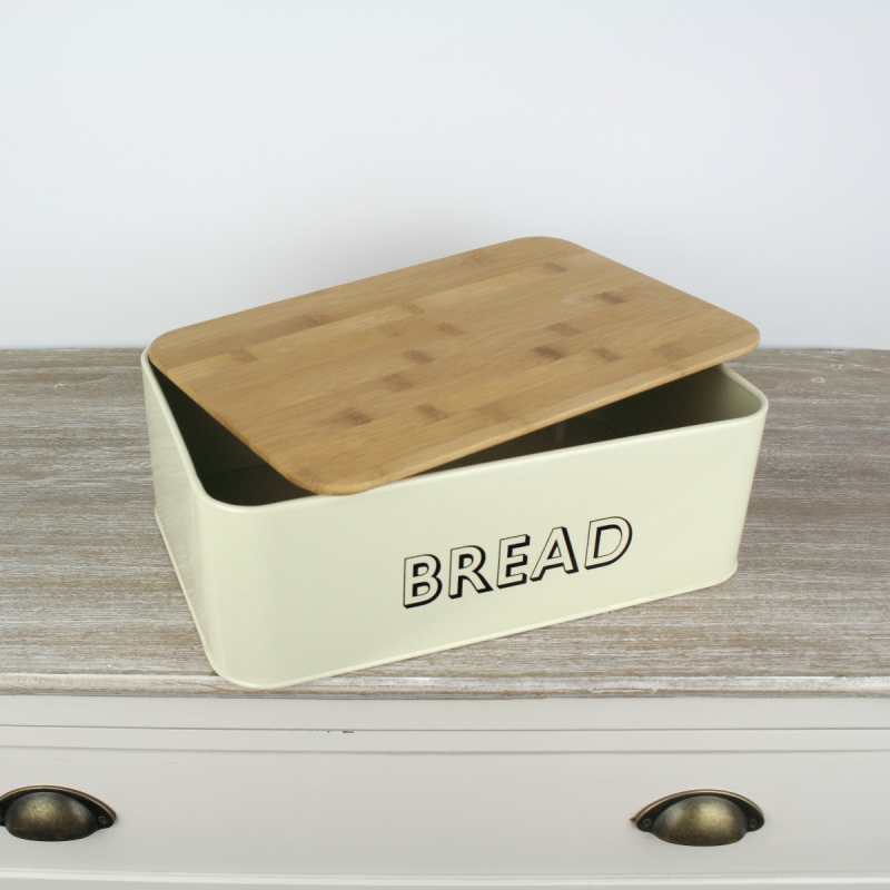Chlebník je kovový s dreveným vekom, ktoré chráni pečivo pred nenechavými hmyzom. Na prednej strane chlebníka je nápis "bread", teda chleba. Na prvý pohľad je jasné, čo sa v krásnej krabici skrýva. Chlebník v rovnakom dizajne je dostupný aj v bielej farbe.