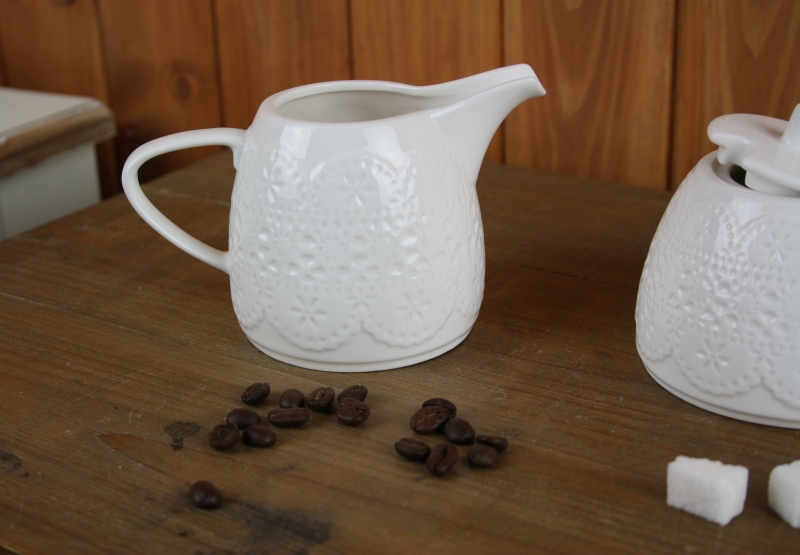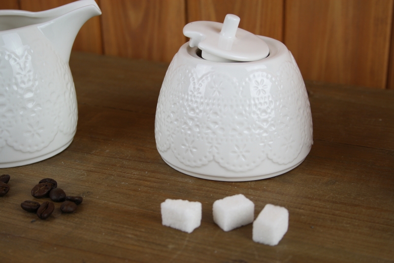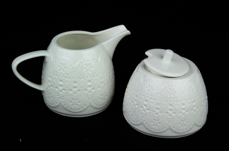 Cukornička a kanvička na mlieko z keramiky s lesklou bielou glazúrou. Obe dózy sú zdobené motívom jemnej čipky, ktorá je po celom obvode. Cukornička má vo viečku otvor na lyžičku.