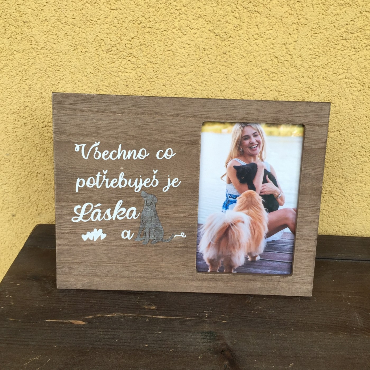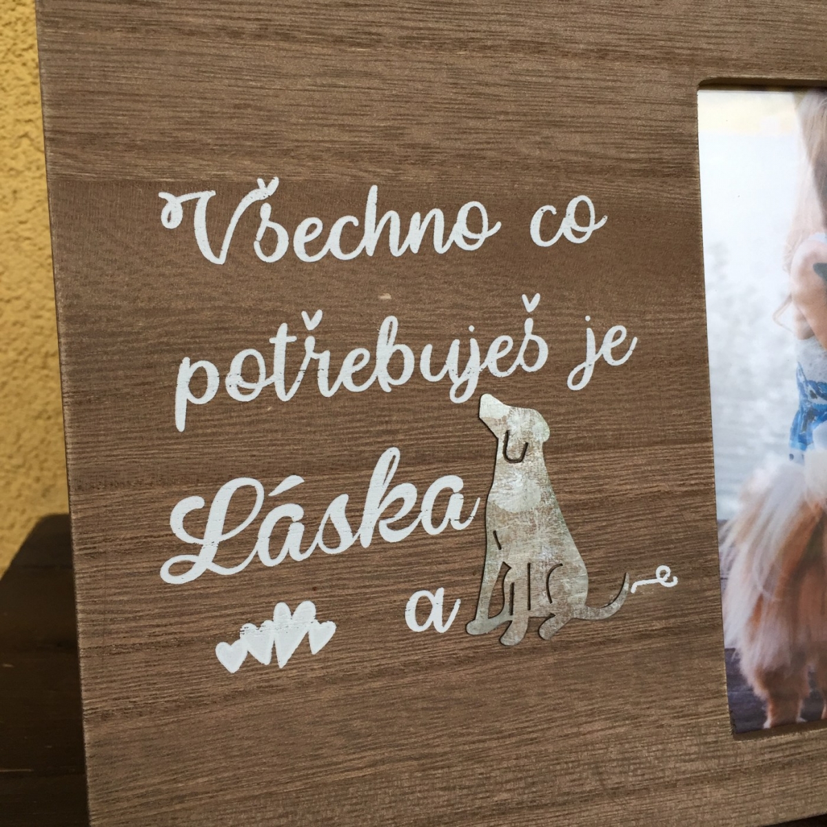 Darček pre psíčkarov fotorámik je zdobený kovovou siluetou psa a nápisom „Všetko čo potrebuješ je láska a ... fotografia psieho priateľa každému napovie, ako veľmi je pre vás váš hafík dôležitý. Návšteva potom určite rada prehliadne aj tých pár chĺpkov, ktoré si od vás odnesie na šatách.