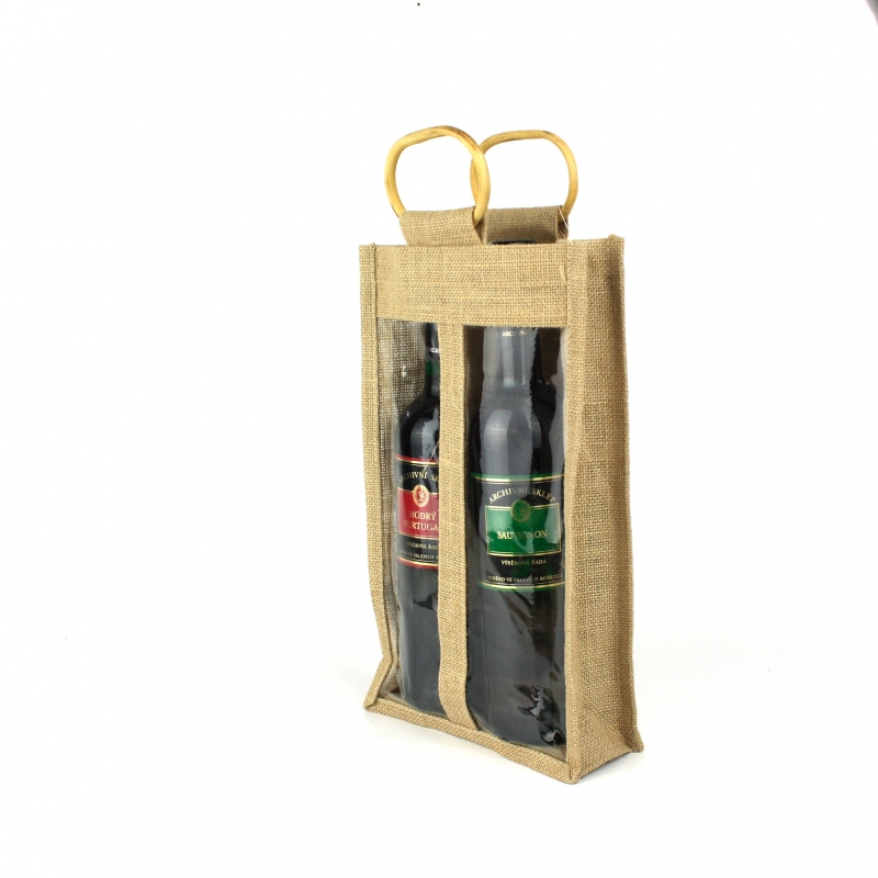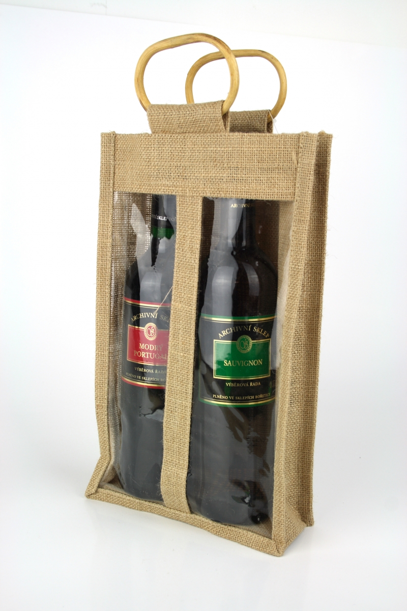 Darčeková taška na 2 vína Vám vyrieši problém, ako vkusne darovať fľašu vína. Táto jutová taška má dve vrecká na fľaše s objemom 0,7l. Má navyše na prednej strane okienka, ktorými je dobre viditeľná etiketa fľaše a obdarovaný tak hneď vie, na akom víne si pochutí.