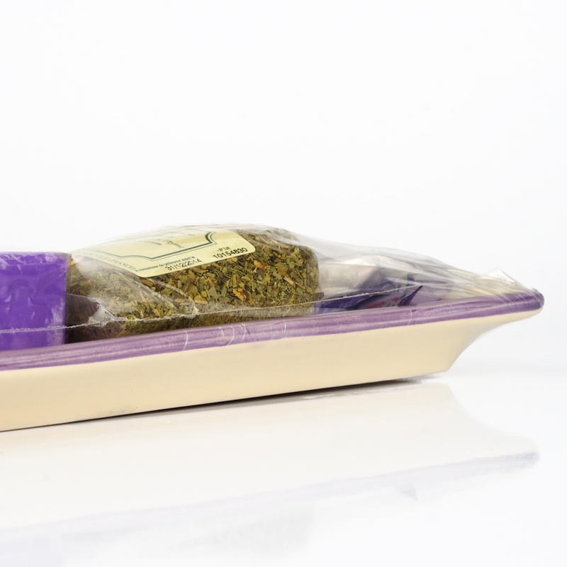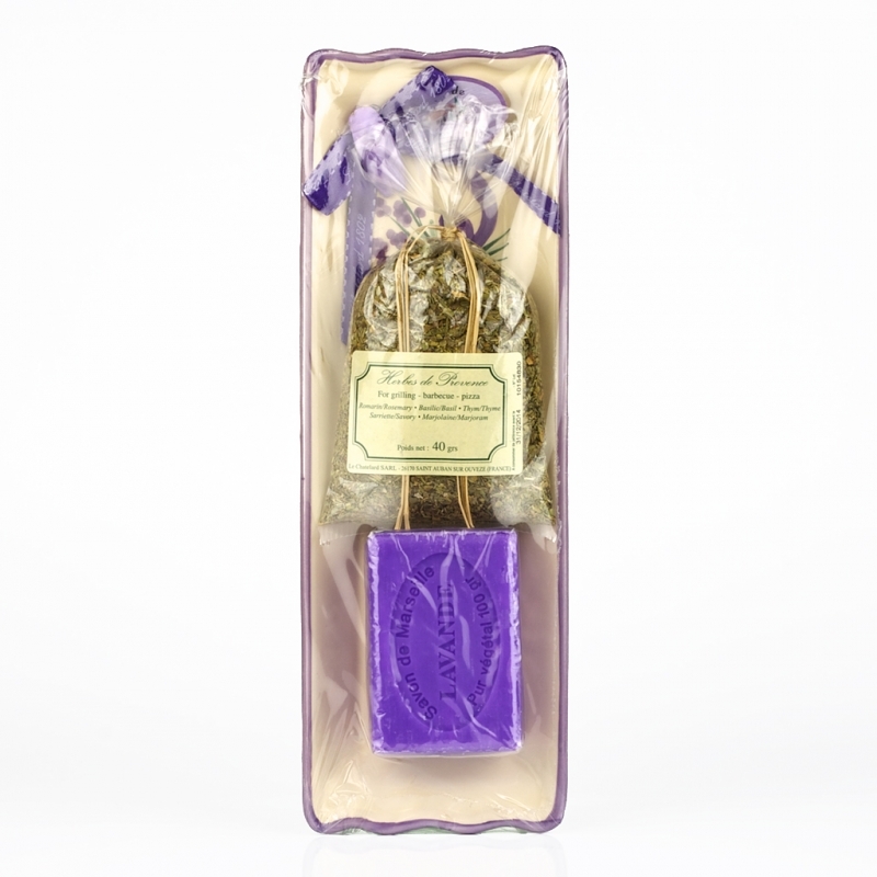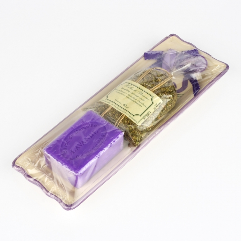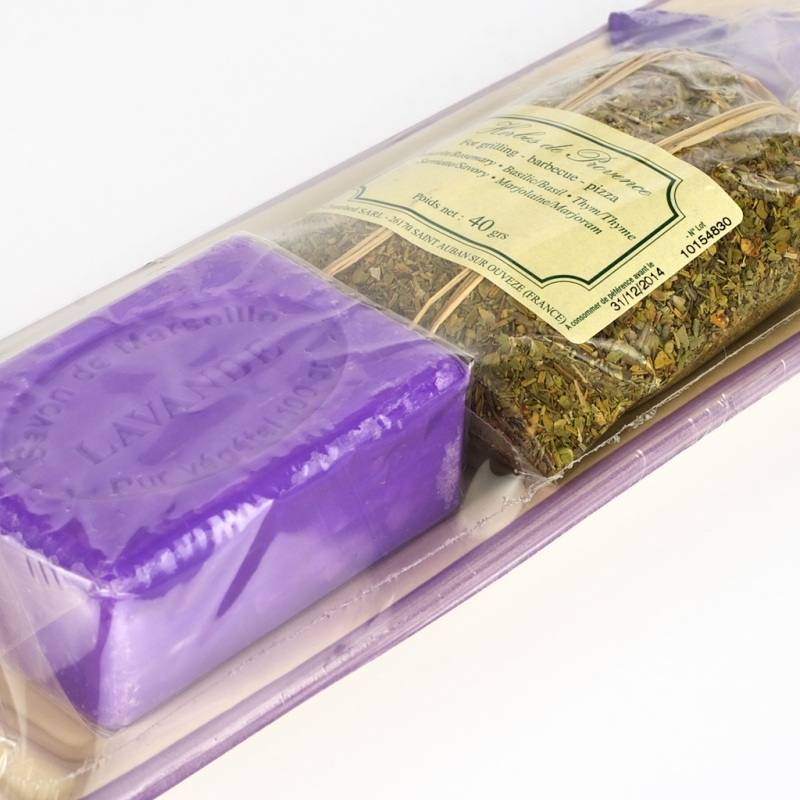 Celkové vonkajšie rozmery sú 9 x 26 cm. Provensálske korenie váži 40 gramov, mydlo potom 100 gramov.