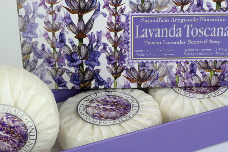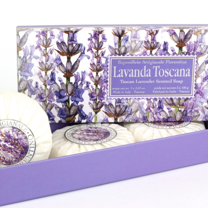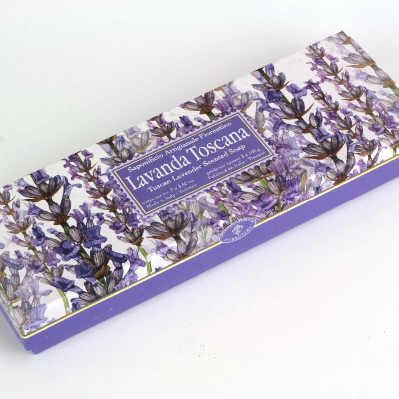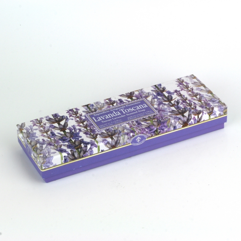 Darčekové balenie mydlo toskánska levanduľa 3x100g od talianskej značky Sapinifico Artigniale Fiorentino patria medzi jedny z najkvalitnejších mydiel na trhu. Prepracovaný dizajn krabičiek aj balenie mydiel im dodáva ešte väčšmi krásy a luxusu.