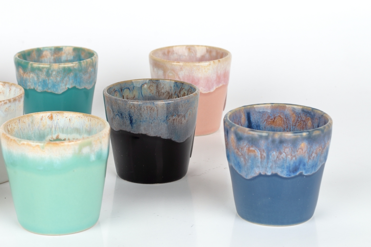 Darčekový box espresso hrnčekov obsahuje 8 hrnčekov s objemom 90 ml v náhodných farbách z kolekcie (farby kolekcie: čierna, svetlo modrá, tyrkysová, tmavo modrá, béžová, ružová, žltá, červená)