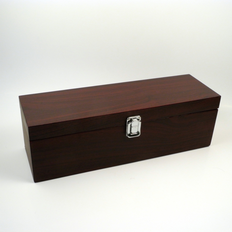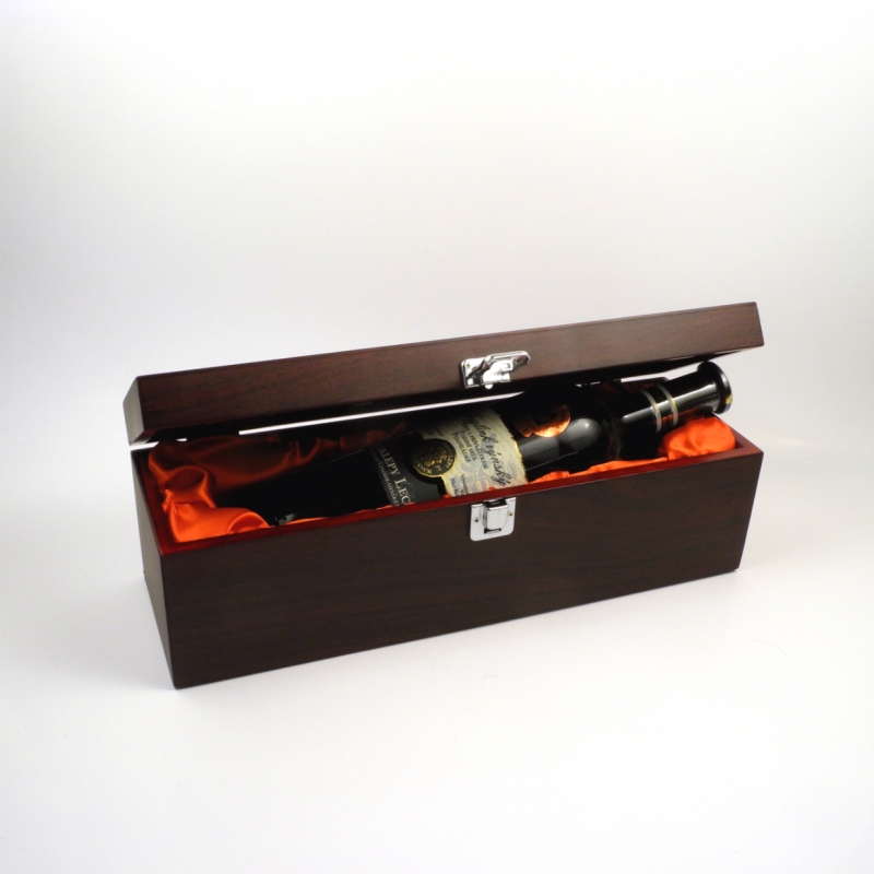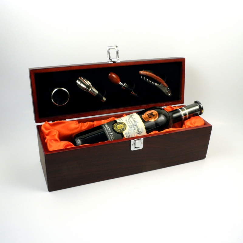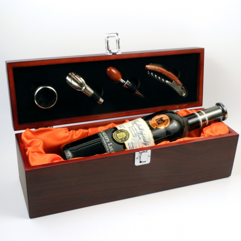 Luxusní dřevěný obal obsahuje otvírák - vývrtka se dřevěým držadlem, uzávěr lahve s těsnící gumičkou, nálevku a kroužek na hrdlo.