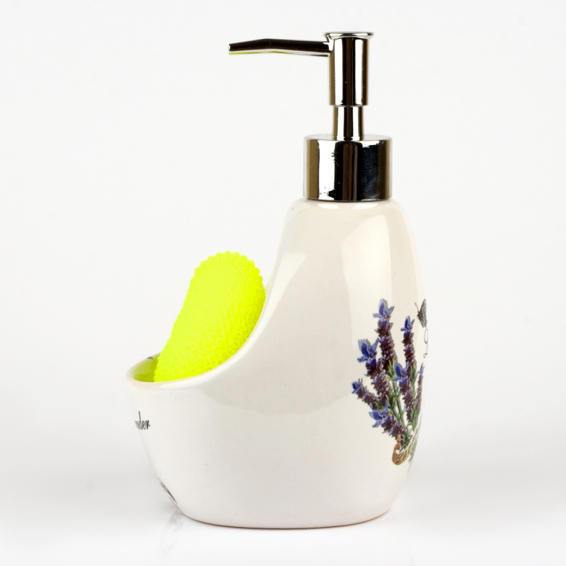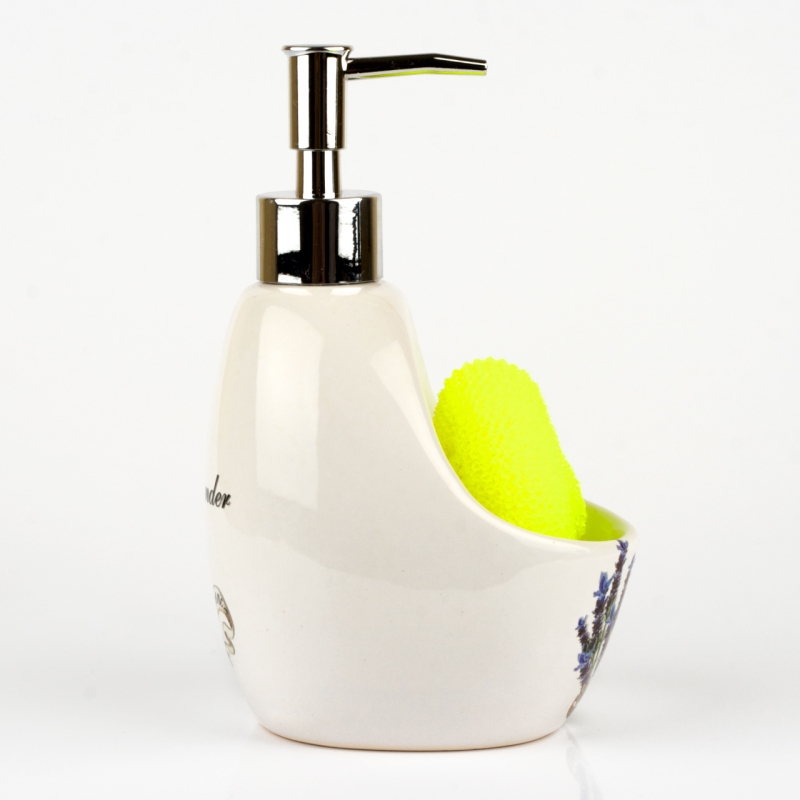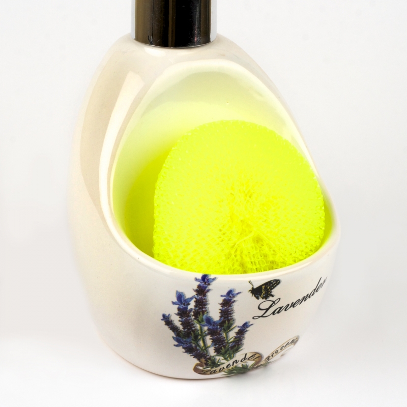 Keramický dávkovač na prostředek na nádobí, je vyroben z keramiky, kovu, plastu a nylonu.