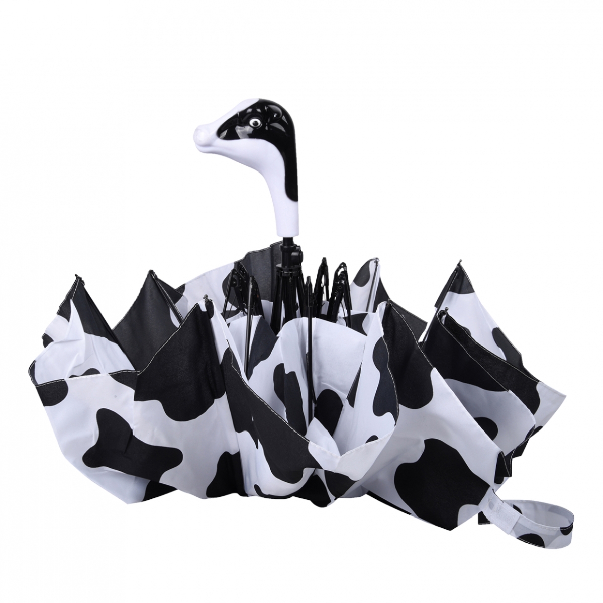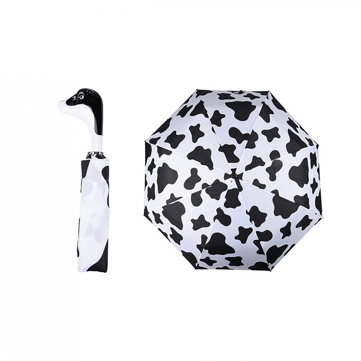 Skladací dáždnik, vo vtipnom poňatí, zaujme svojim čistým a originálnym dizajnom. Biela strecha s čiernymi fliačikmi a čierna kovová konštrukcia, sú doplnené madlom, ktoré má podobu hlavy čierno-biele kravičky. Veselí motív urobí radosť prakticky komukoľvek, kto má rád vtip, preto je vhodný aj ako milý darček.