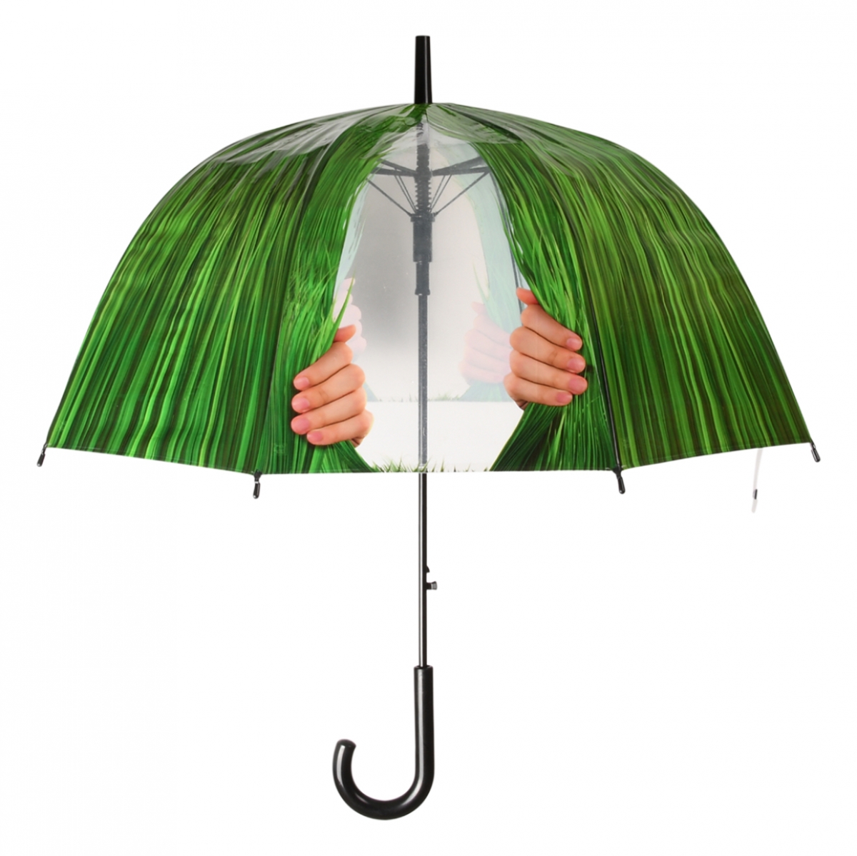 Originálny a vtipný dáždnik, naplno využíva transparentnosti plastového materiálu, z ktorého je vyrobená jeho strecha. Jeho potlač tvorí hustá zelená tráva, ktorú v štyroch miestach rozhŕňajú ruky. Práve tu, v miestach bez potlače, vznikajú priehľady.