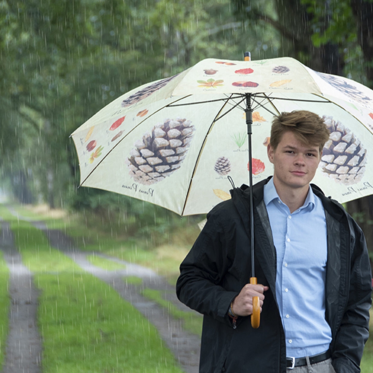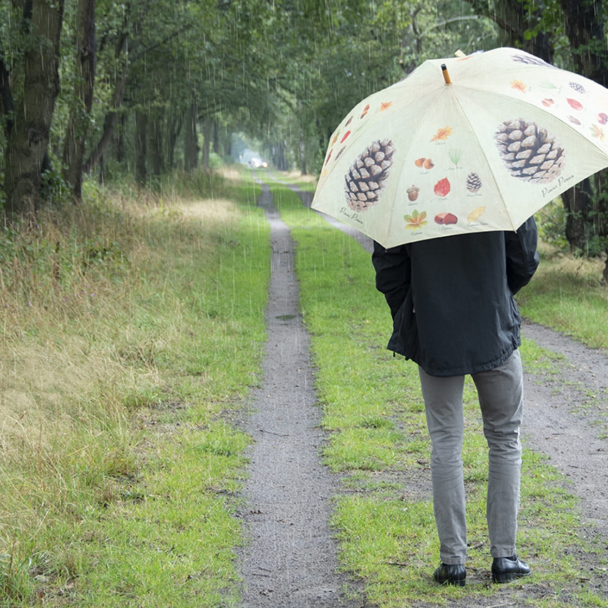 Na dáždnika nájdete zobrazenie listu a žaluďa Dubu letného, listu a orieška Lísky všeobecné, vetvičky a šišky Borovice pínie, listu a gaštanu Jírovca konského a listu a gaštanu Gaštana siateho. Naviac je u každého obrázku napísané aj jeho latinské meno.